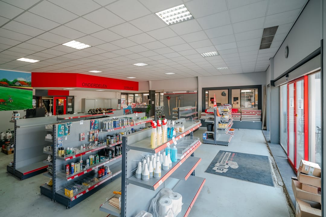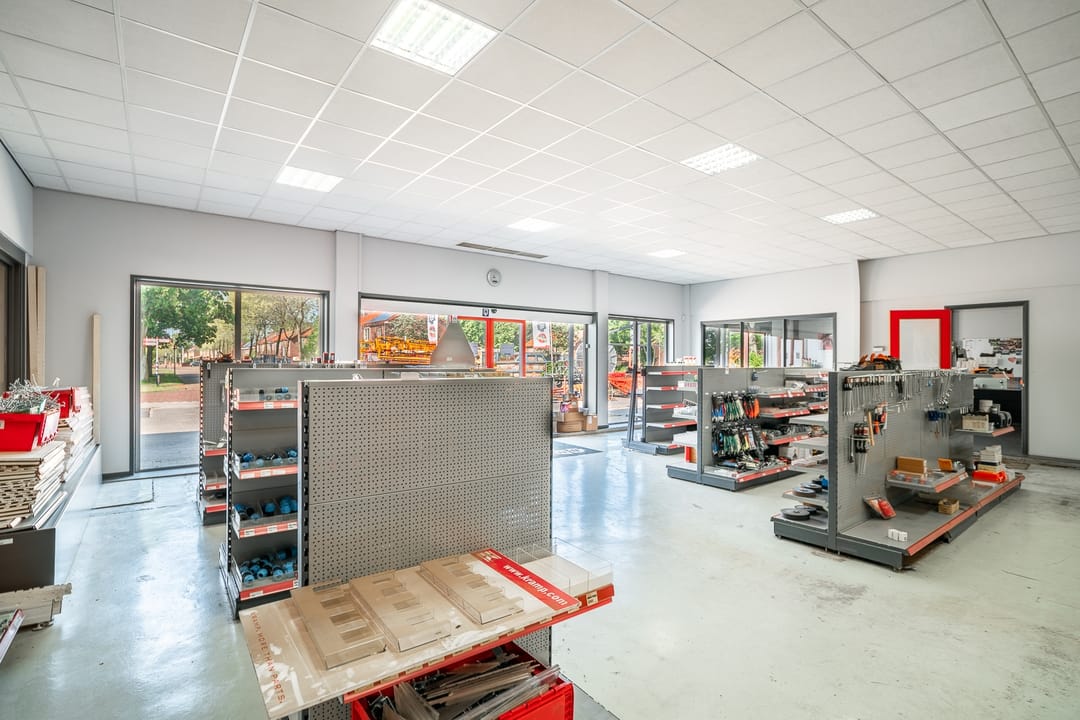 - voorzijde showroom (ca. 145 m2) met balie, glazen pui met eclectische toegangsdeuren
