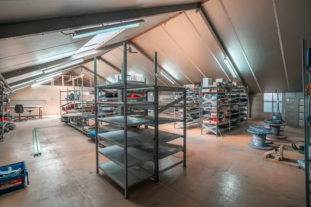 - magazijnruimte verdieping ca. 185 m2 met heater en houten vloer.
