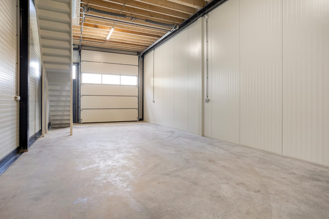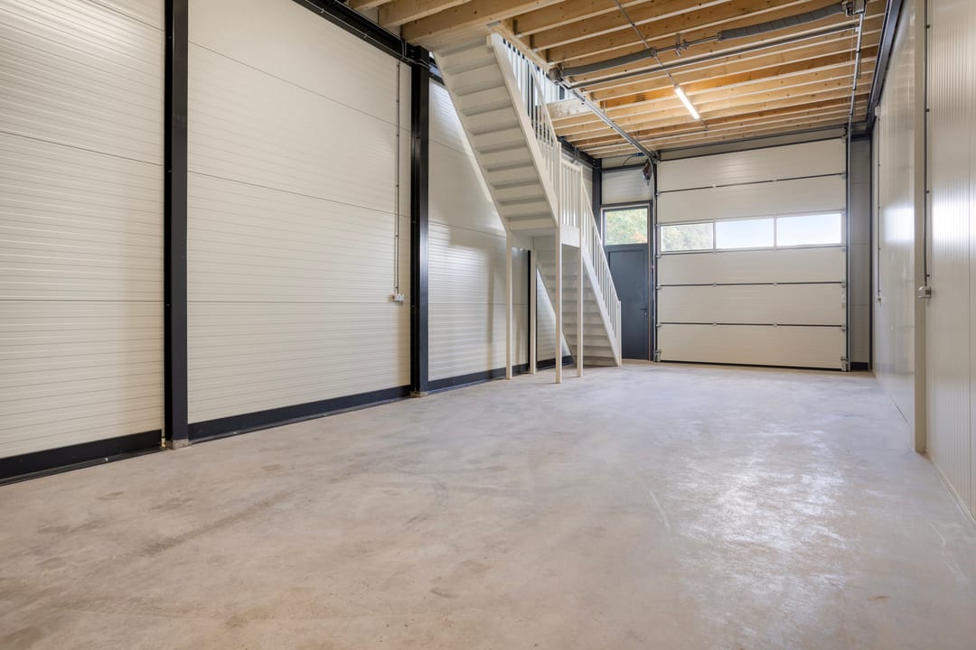 • Begane grond: ca. 60 m² BVO (frontbreedte ca. 5 m, diepte ca. 12 m), vrije hoogte ca. 4,30 m tot onderzijde entresolvloer. Voorzien van geïsoleerde overheaddeur, separate loopdeur, betonvloer, pantry en toilet.