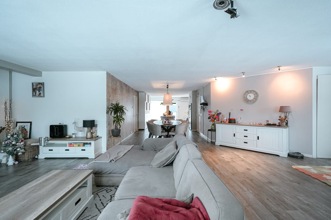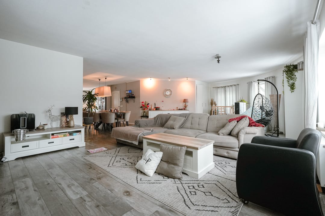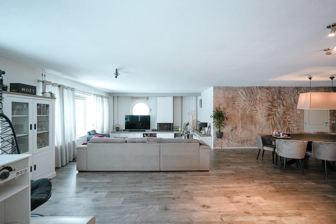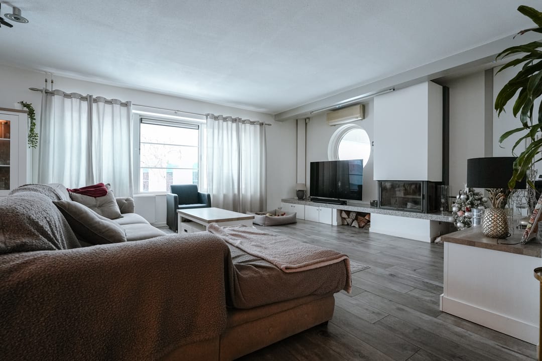De woonkamer is royaal van opzet en beschikt over veel natuurlijke lichtinval dankzij de aanwezige raampartijen. De kachel zorgt voor extra comfort en sfeer, waardoor deze ruimte zeer geschikt is voor dagelijks gebruik en ontspanning.