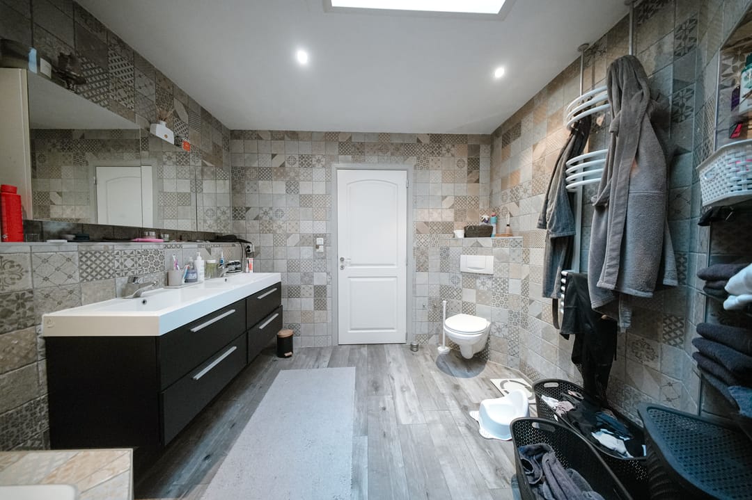 Via de hal is de badkamer bereikbaar. Deze is ruim uitgevoerd en voorzien van een dubbele wastafel met bijbehorende opbergruimte en spiegels, een toilet, een douche en een ligbad.