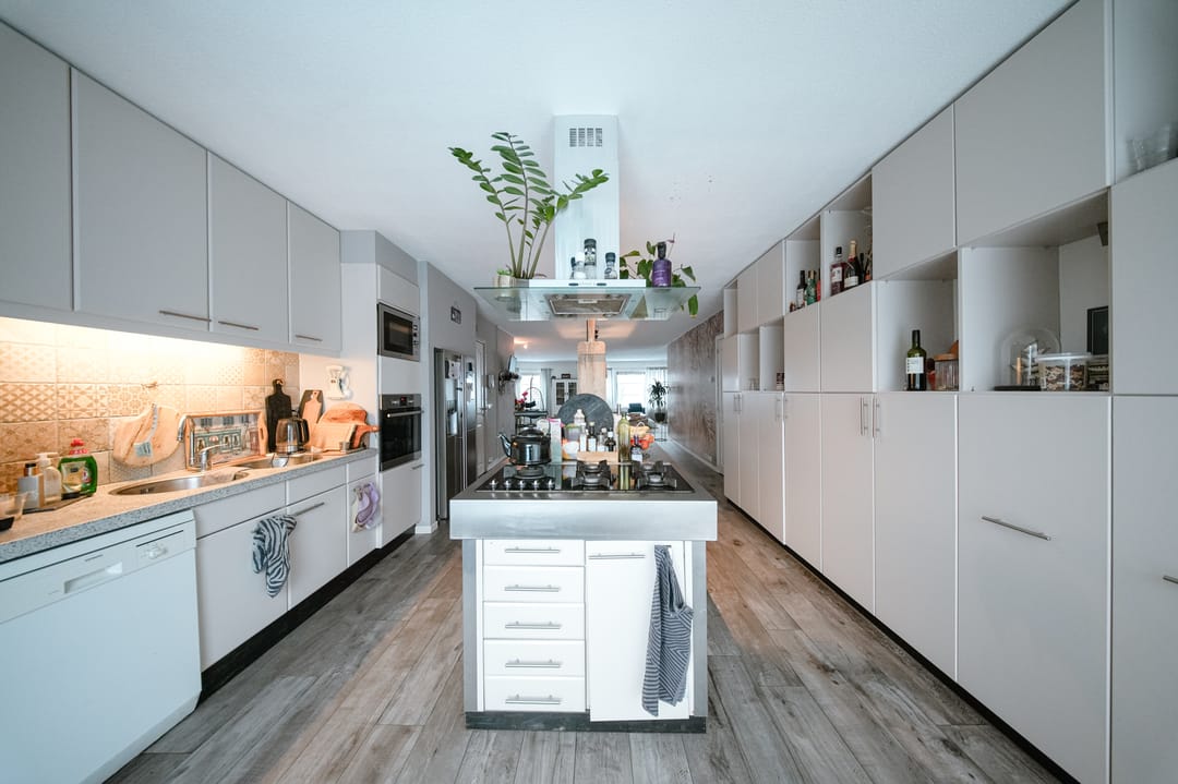 De open keuken vormt een centraal onderdeel van de woning en is uitgevoerd met een modern kookeiland. De keuken is voorzien van diverse inbouwapparatuur, waaronder een oven, magnetron en vaatwasser, en beschikt over veel opberg- en kastruimte. Door de open opzet staat de keuken in directe verbinding met de eethoek en de woonkamer, wat zorgt voor een ruimtelijk en licht geheel.