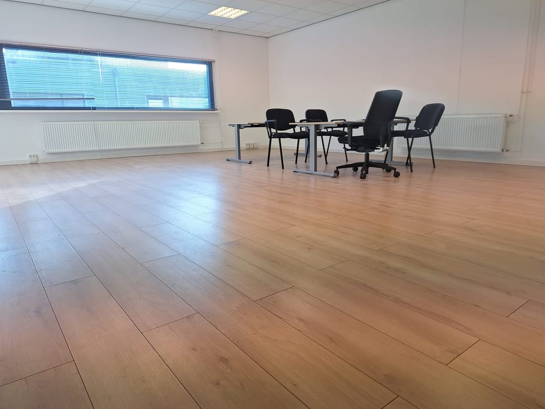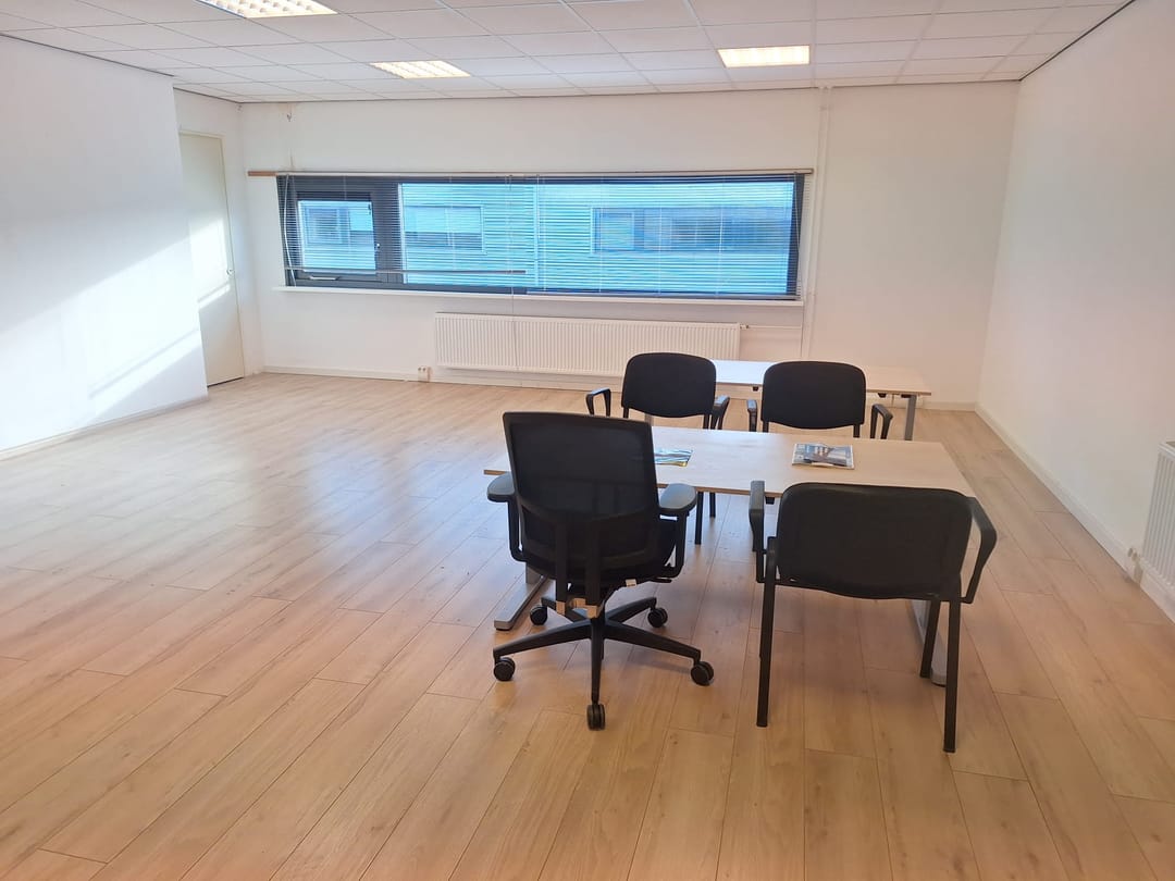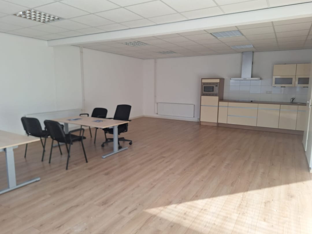 Op de eerste verdieping bevindt zich een comfortabele en lichte kantoorruimte van circa 60 m². De ruimte is praktisch ingedeeld en afgewerkt met een laminaatvloer. Dankzij het grote raam is er veel natuurlijke lichtinval, wat zorgt voor een prettige werksfeer. Verder beschikt het kantoor over: