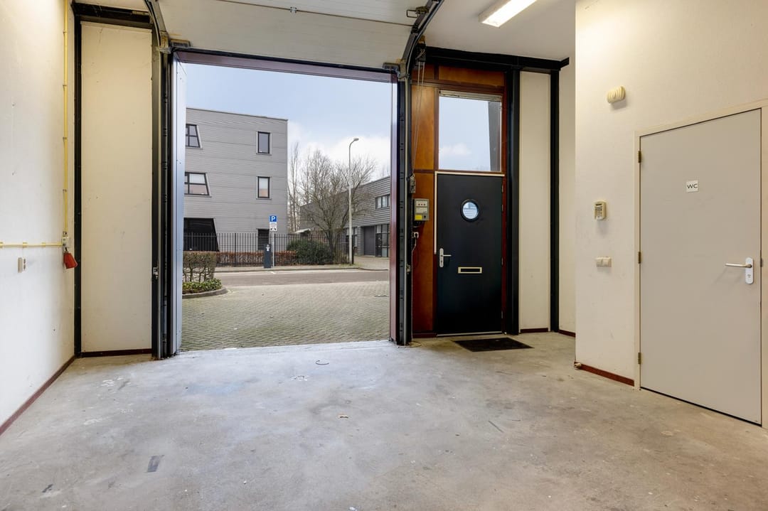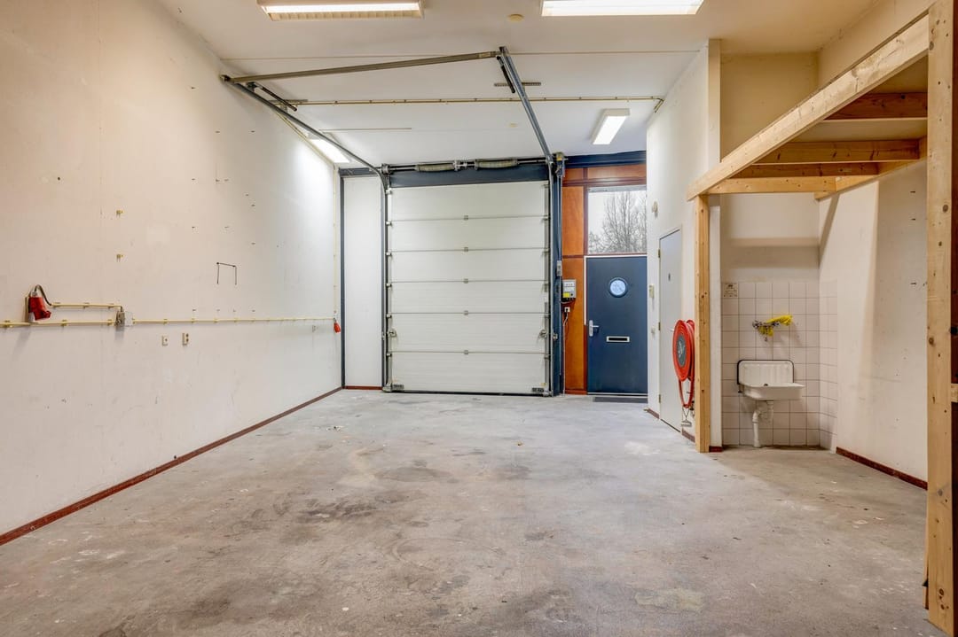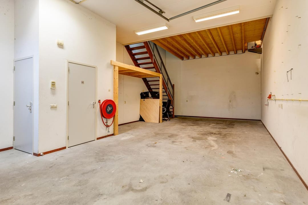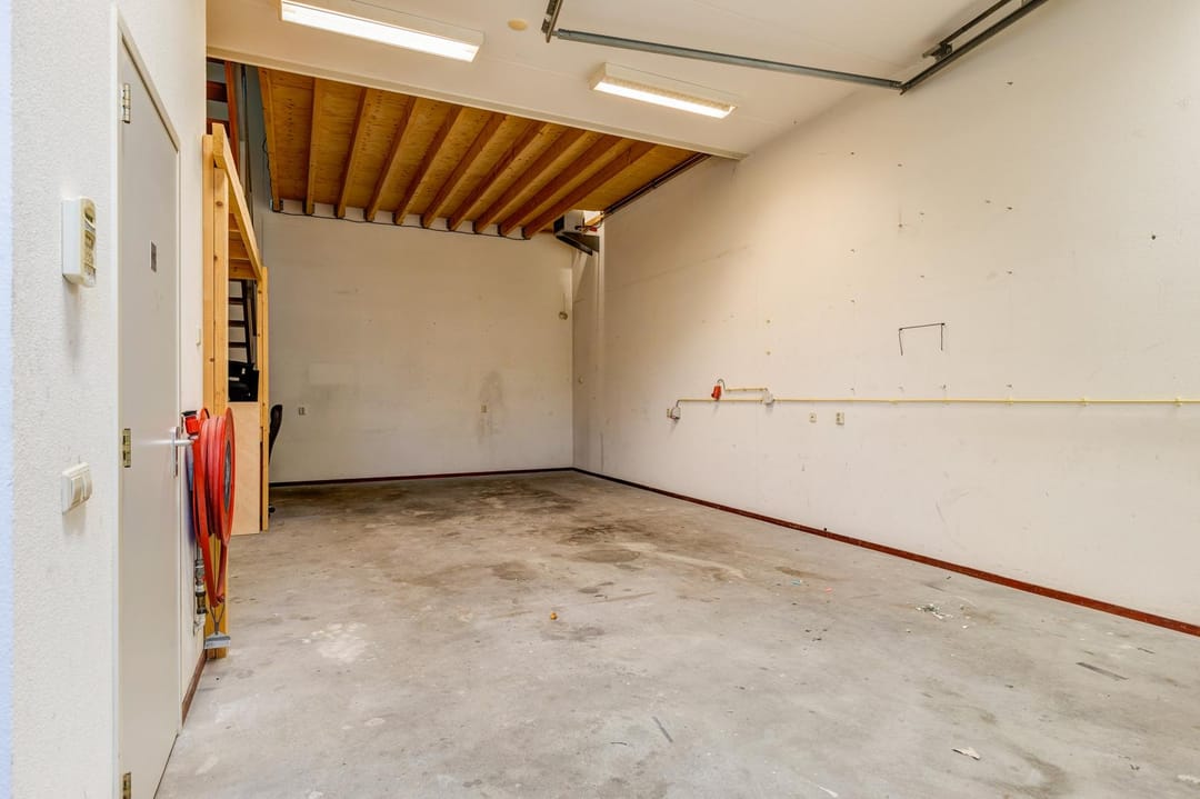 De begane grond is een open ruimte voorzien van toilet met fonteintje en is voorzien van een elektrische overheaddeur. De eerste verdieping is ingedeeld in meerdere ruimtes en is voorzien van een eigen pantry.