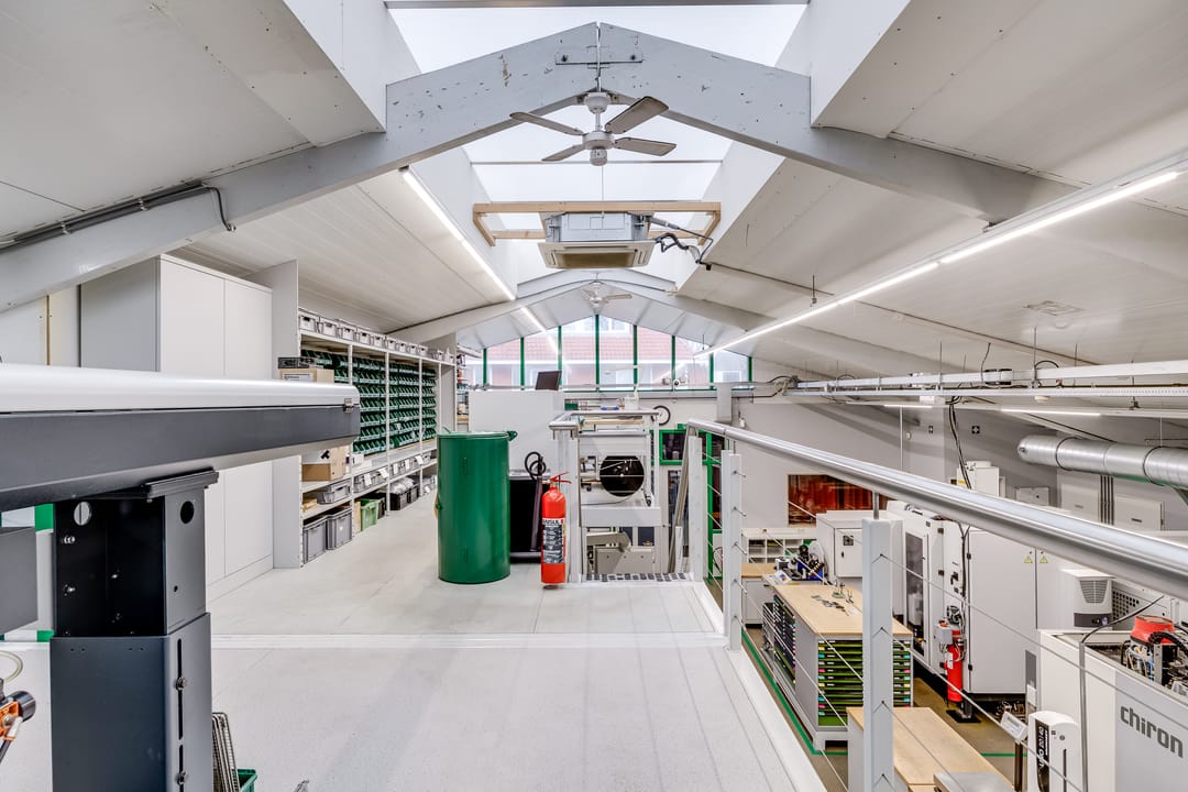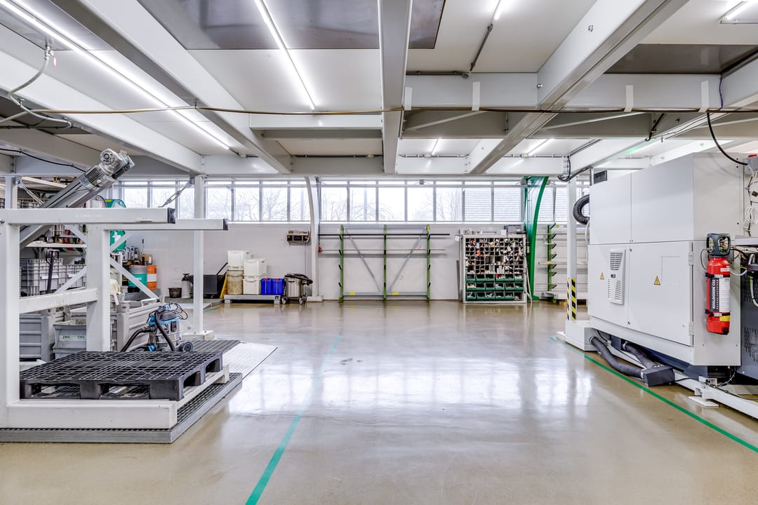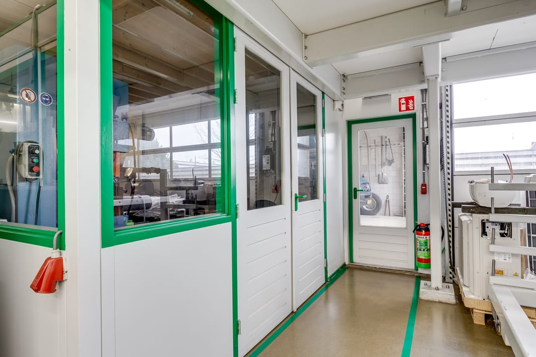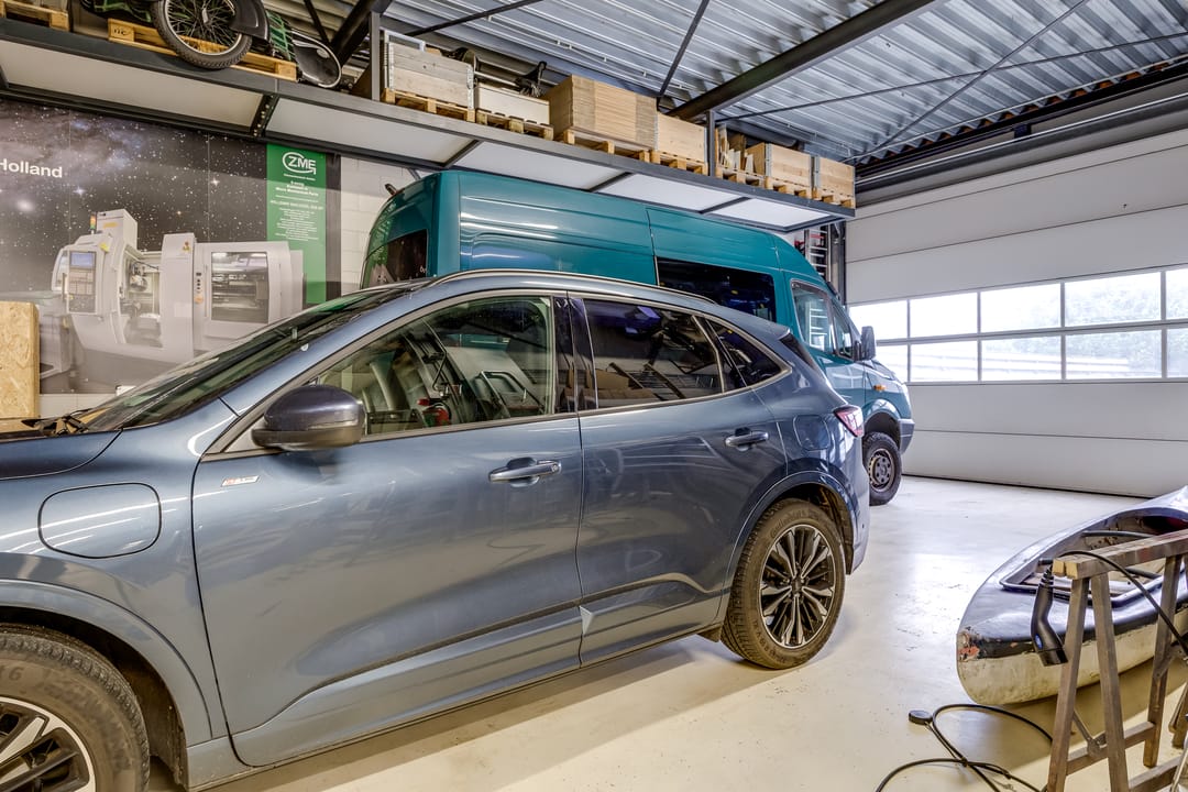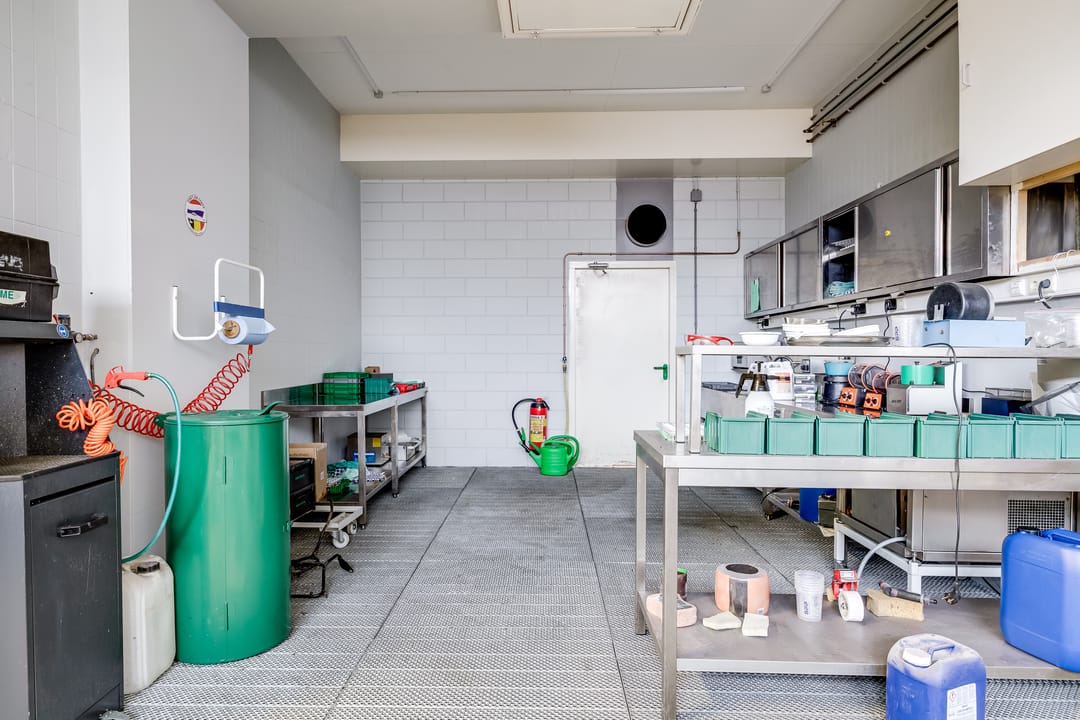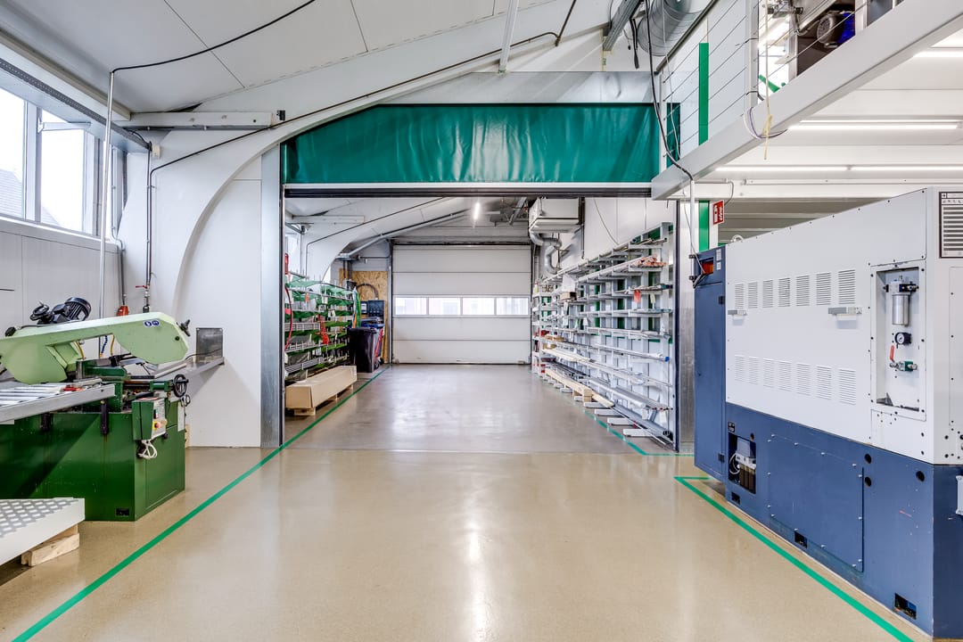 De hoofdhal is uitgerust met twee Schneider Canalis railkokersystemen van elk 100A, waardoor machines eenvoudig en flexibel kunnen worden aangesloten of verplaatst zonder extra bekabeling. Daarnaast is er een uitgebreide verdelerkast met veel krachtgroepen en 230V-groepen. De elektra-aansluiting is opgewaardeerd naar een 100 kVA grootverbruik aansluiting (3x160A), met een eigen voeding vanaf het nabijgelegen laagspanningsstation. De verlichting in de hal wordt verzorgd door energiezuinige LED-lichtlijnen. Verwarming vindt plaats via drie airco/warmtepompsystemen in de nok, terwijl het kantoorgedeelte wordt verwarmd via een CV-installatie. De bijgebouwen aan de oostzijde zijn traditioneel gebouwd en voorzien van platte daken. De voormalige autowasplaats is omgebouwd tot een reinigings- en finishingruimte met roostervloer en een waterdichte opvangbak, voorzien van een dompelpomp en krachtige dakventilator.