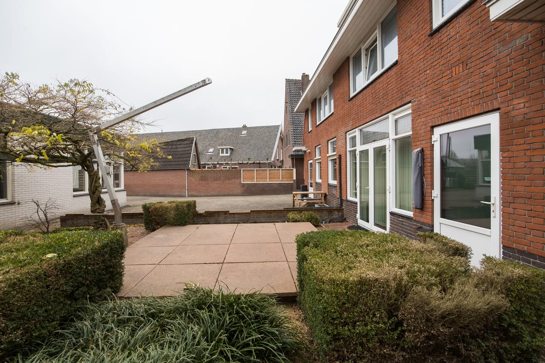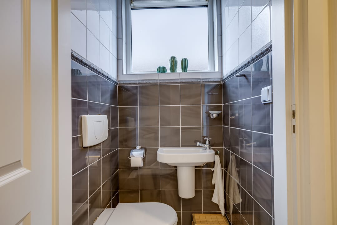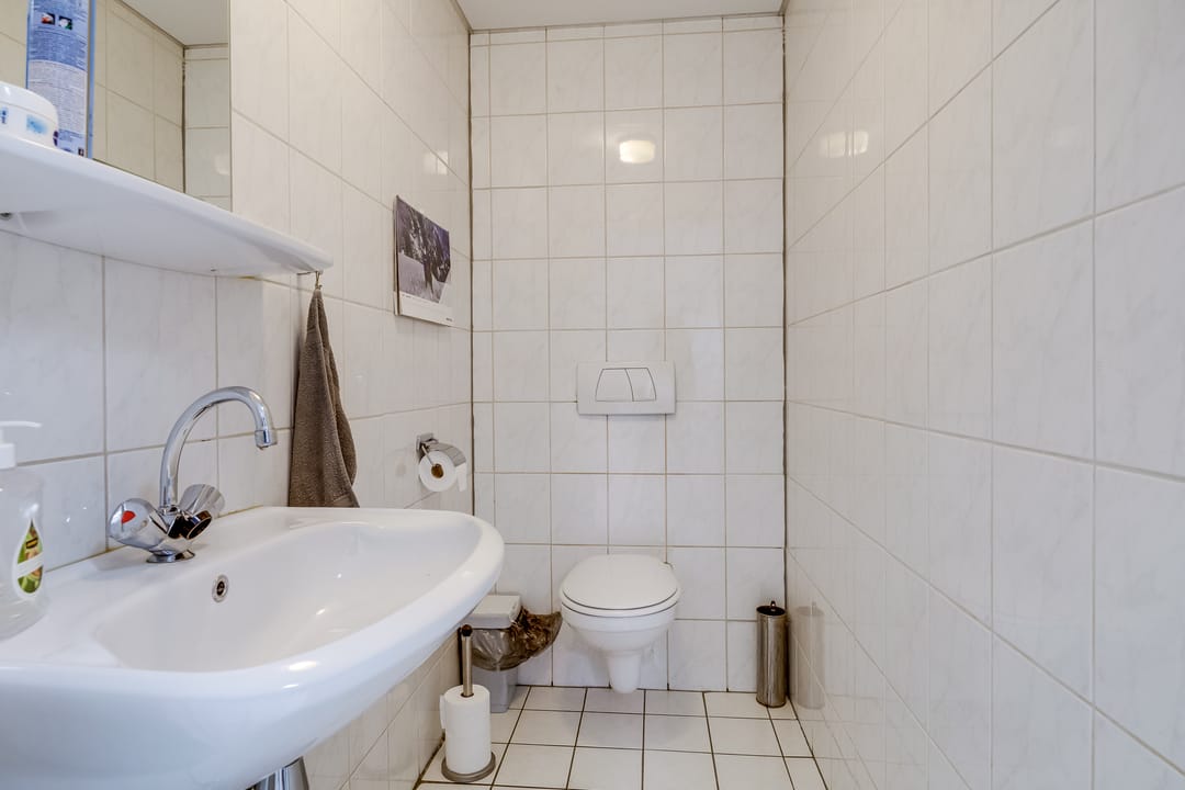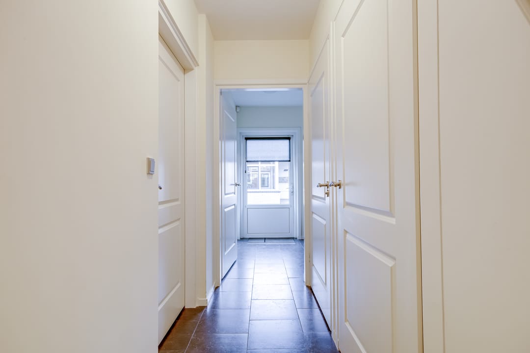 De keuken ligt aan de achterzijde en is praktisch ingedeeld, met directe verbinding naar de woonkamer. Aangrenzend bevinden zich een bijkeuken en diverse vaste kasten, ideaal voor opslag en huishoudelijke functies. De entree en hal zijn ruim opgezet en geven toegang tot het toilet en de trap naar boven.