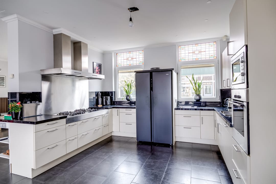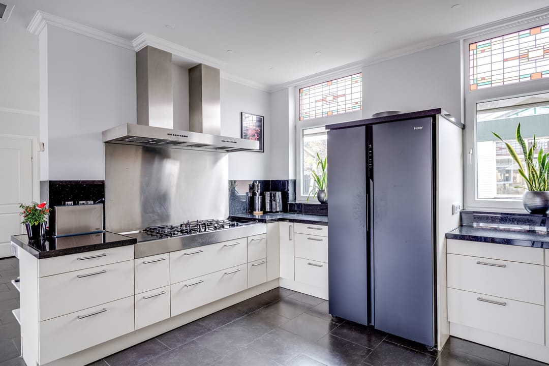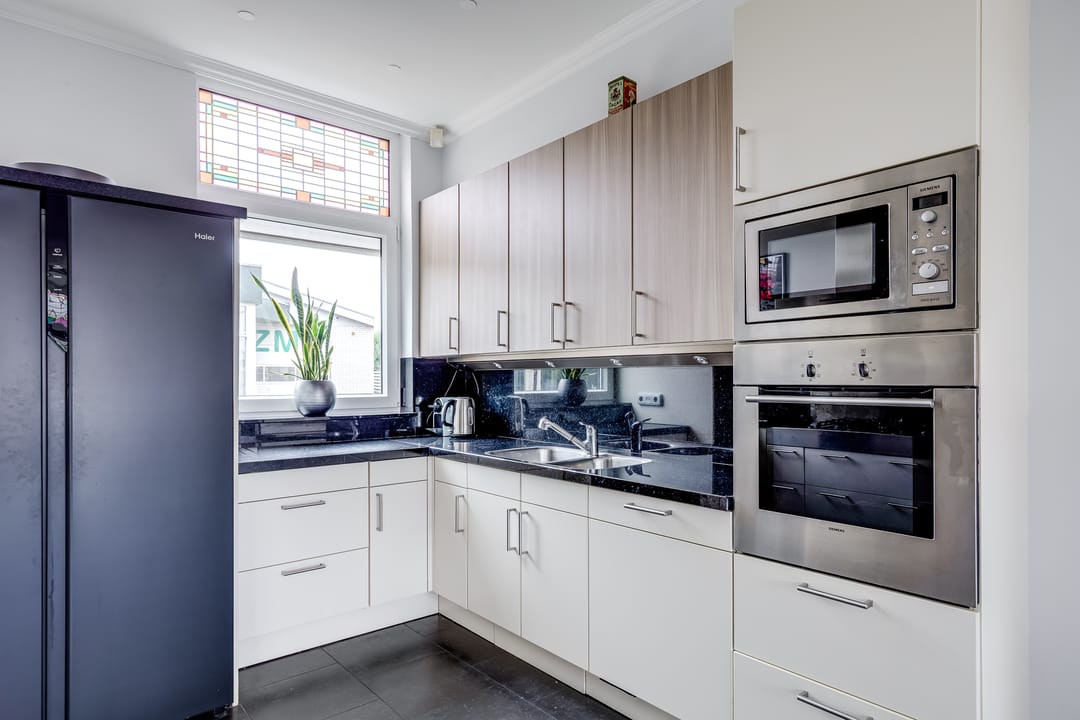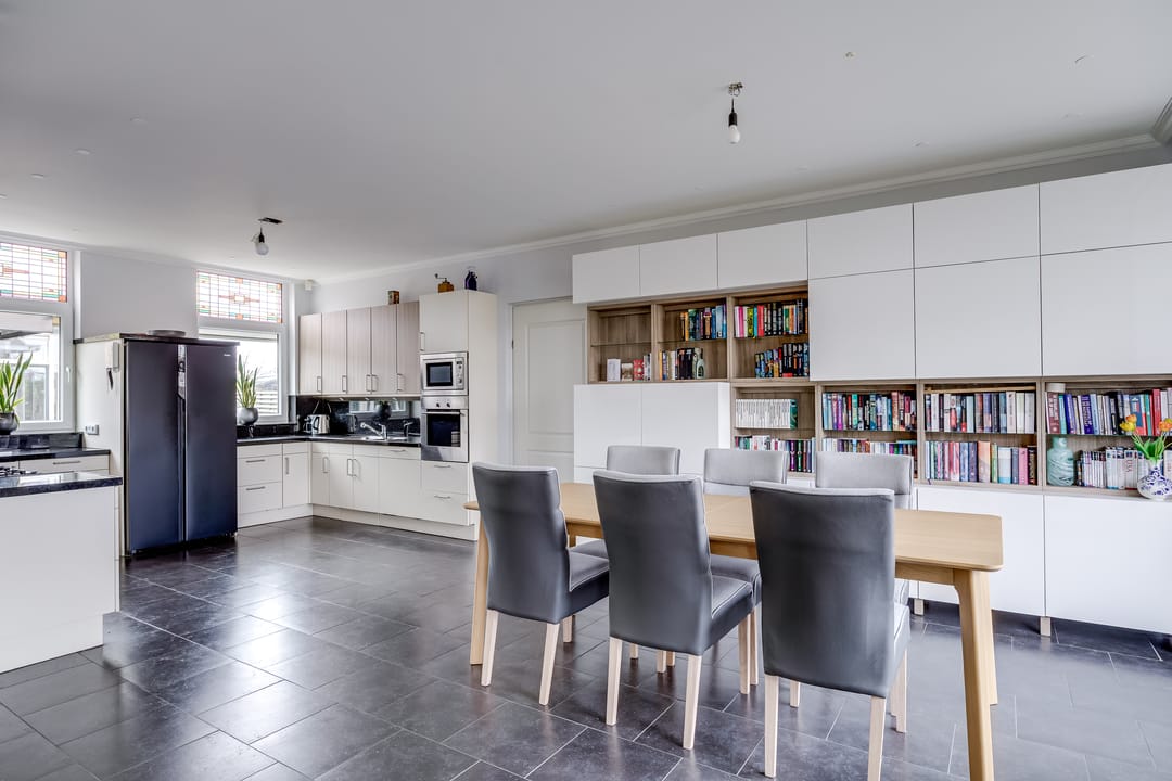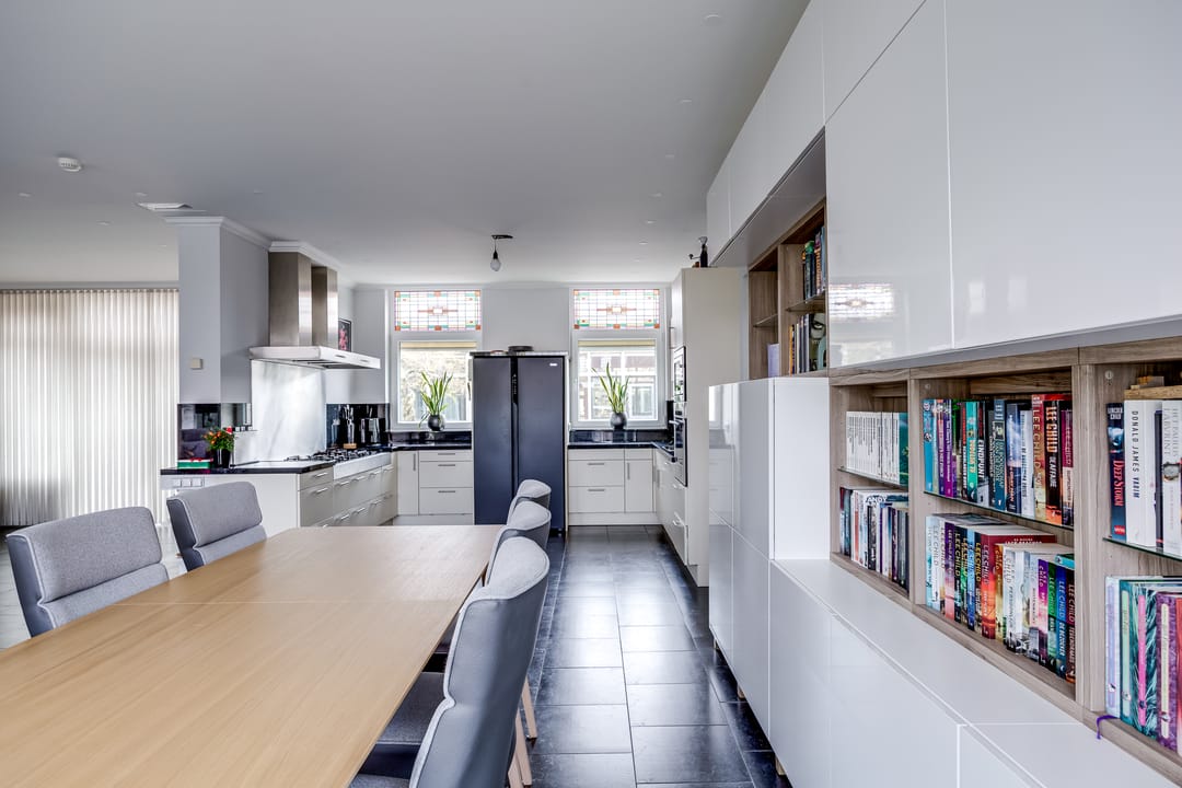 De keuken ligt aan de achterzijde en is praktisch ingedeeld, met directe verbinding naar de woonkamer. Aangrenzend bevinden zich een bijkeuken en diverse vaste kasten, ideaal voor opslag en huishoudelijke functies. De entree en hal zijn ruim opgezet en geven toegang tot het toilet en de trap naar boven.