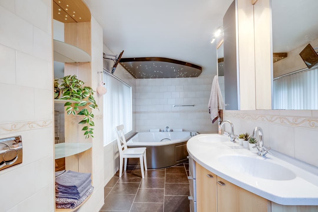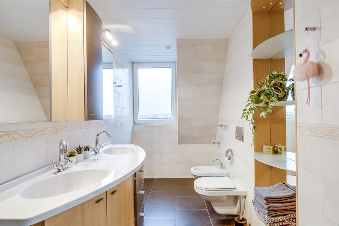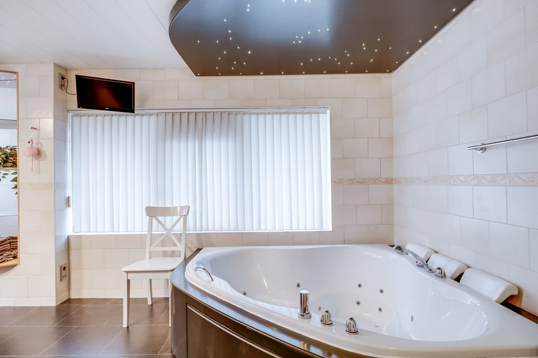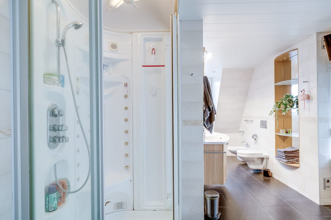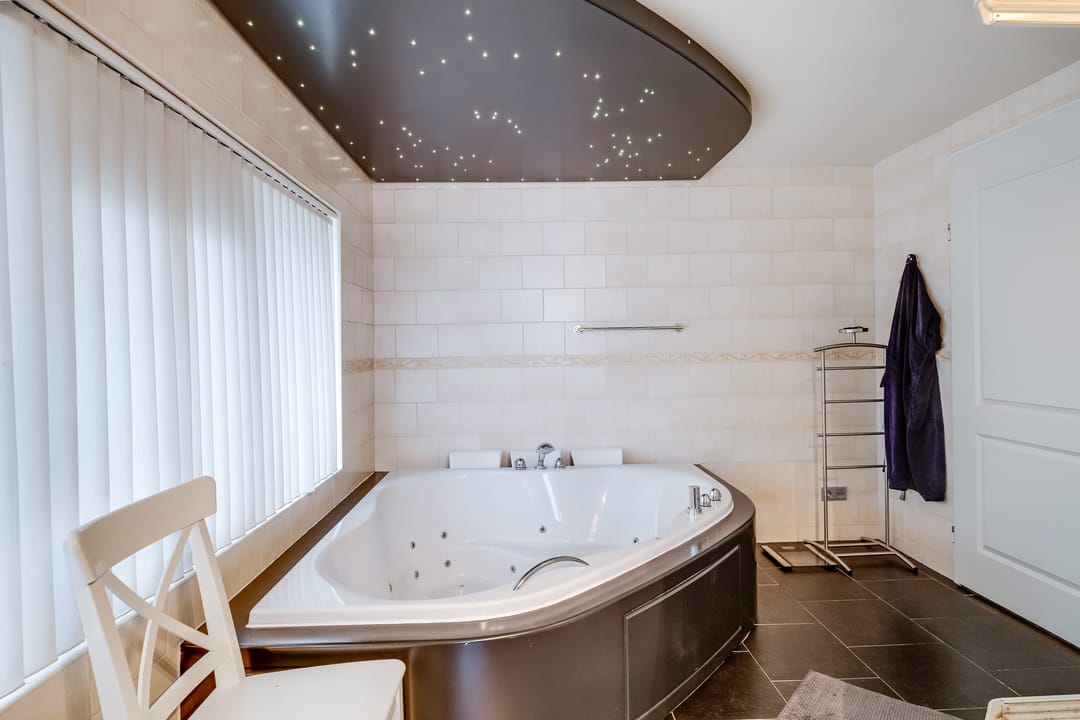 De badkamer is ruim en compleet uitgevoerd met een ligbad/jacuzzi, aparte douche, wastafel en toilet. Dankzij de ramen en indeling is dit een comfortabele en lichte verdieping, ideaal voor gezinnen of wie veel kamers nodig heeft.