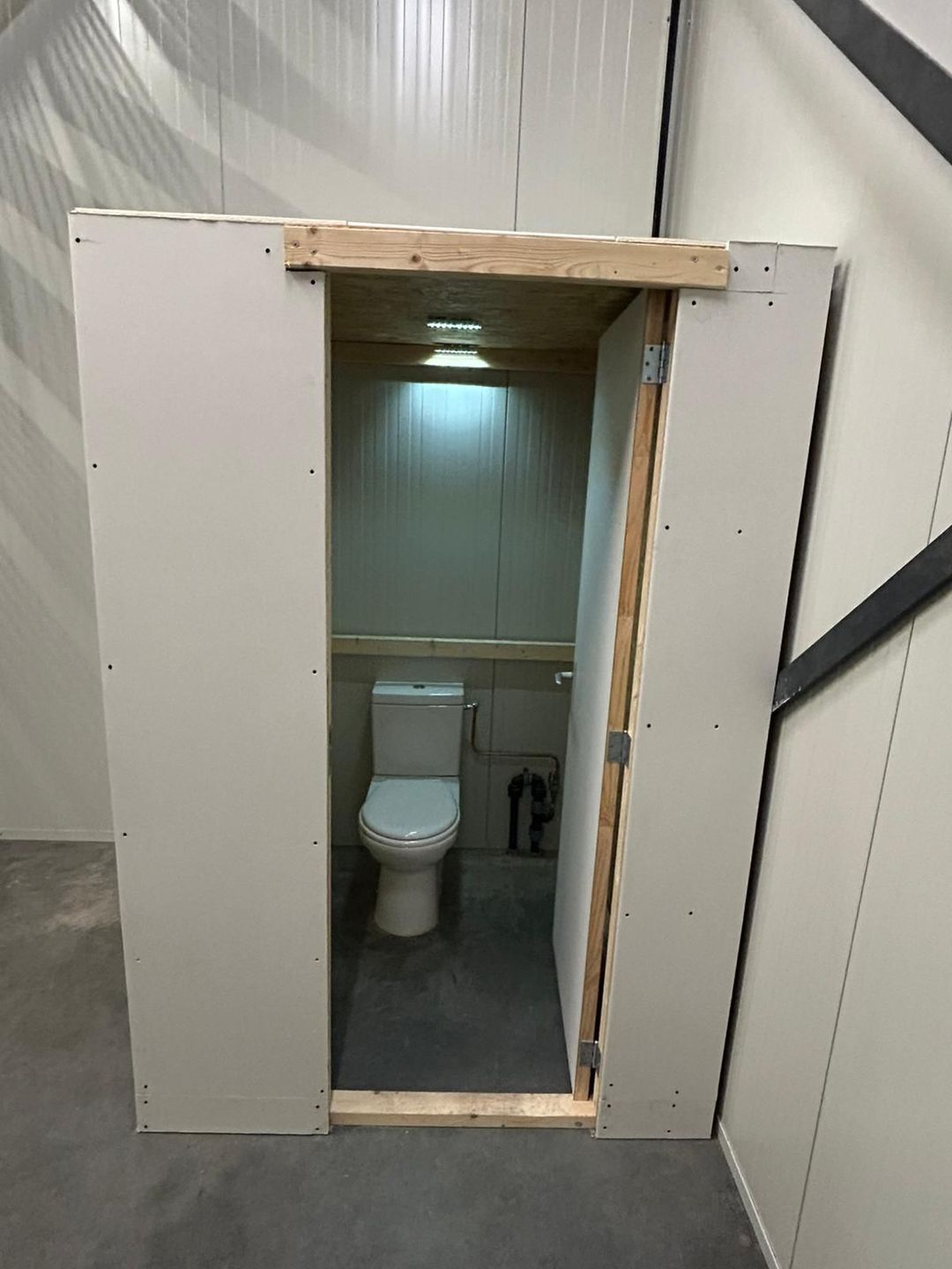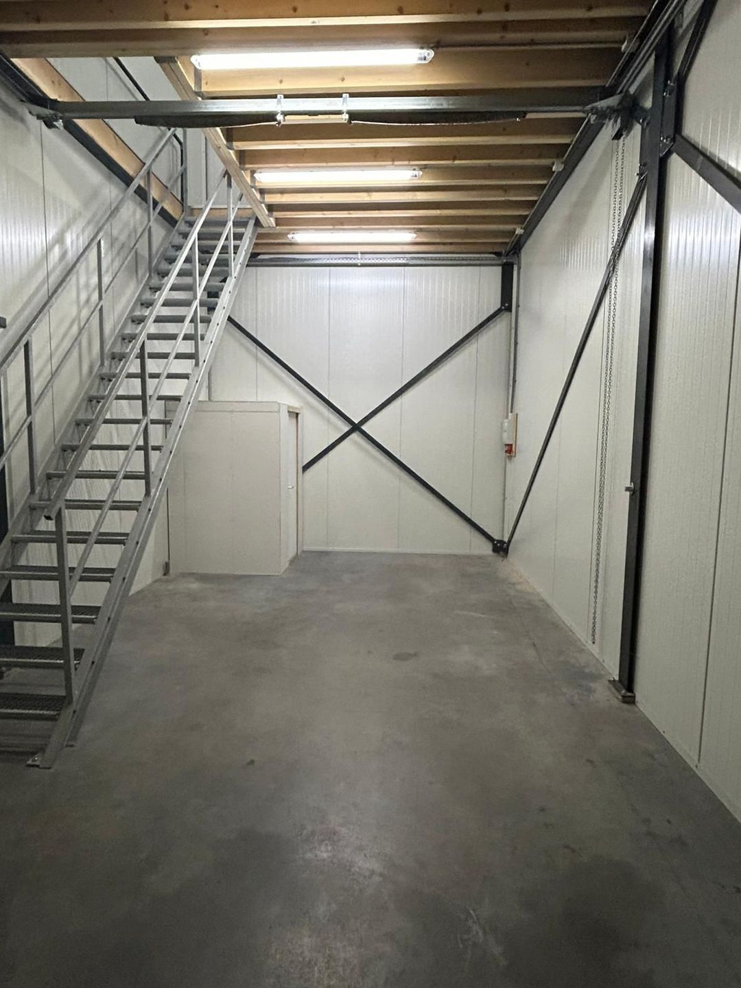 Bedrijfsruimte voorzien van een toilet, betonvloer, overheaddeur met een hoogte van ca. 4 meter en stalen trapopgang naar de verdieping.