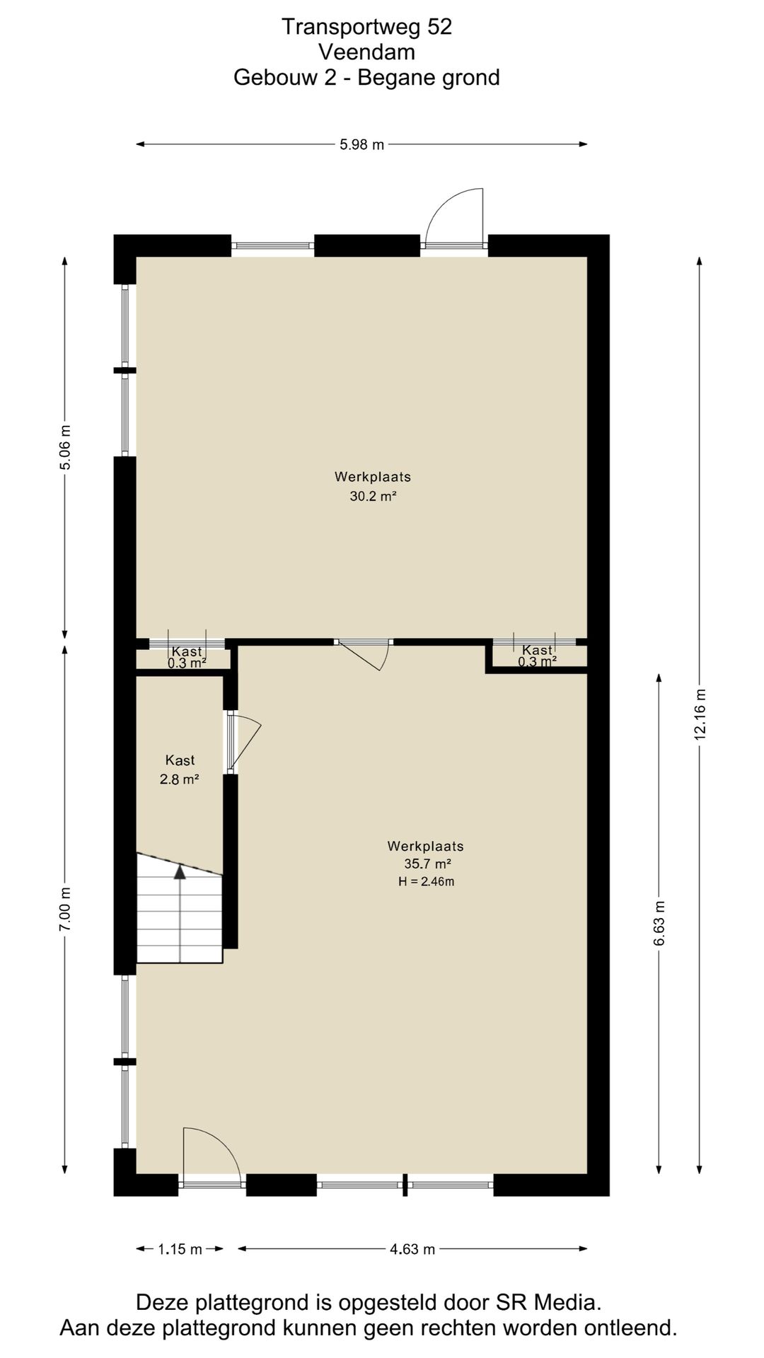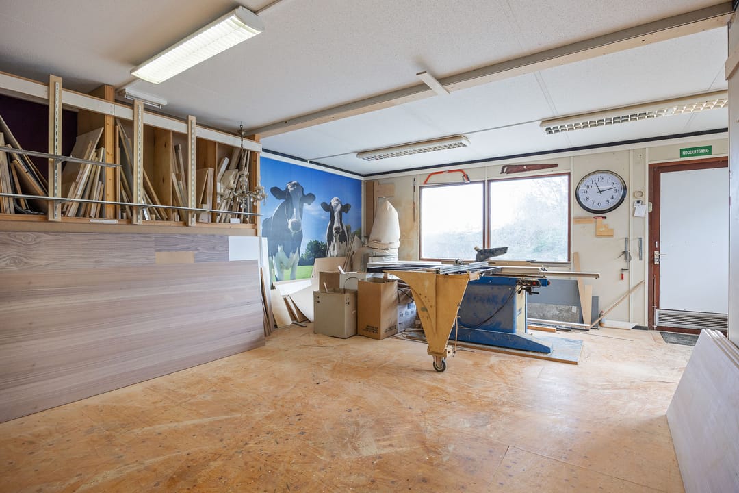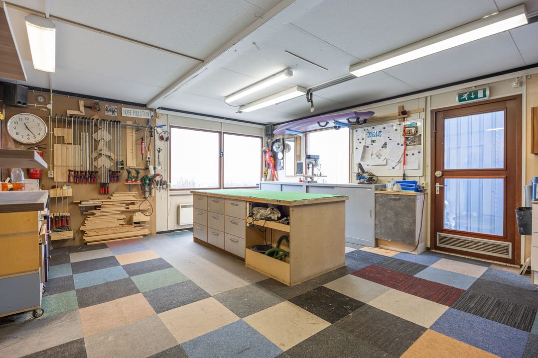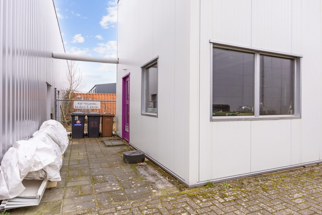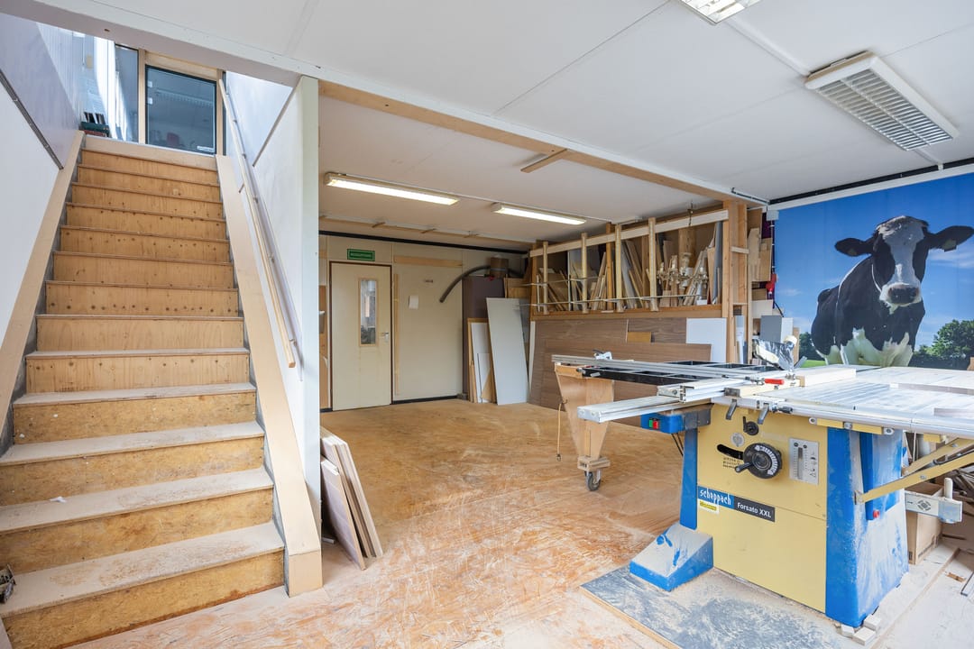 Het tweede bedrijfspand (thans in gebruik als werkplaats) beschikt over circa 138 m² verhuurbaar vloeroppervlak, verdeeld over circa 70 m² op de begane grond en circa 68 m² op de verdieping. Deze ruimte is zeer geschikt voor ambachtelijke werkzaamheden, werkplaatsgebruik, opslag, magazijn of een combinatie met kantoor-/showroomfunctie.