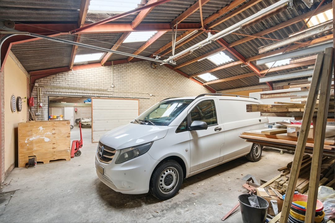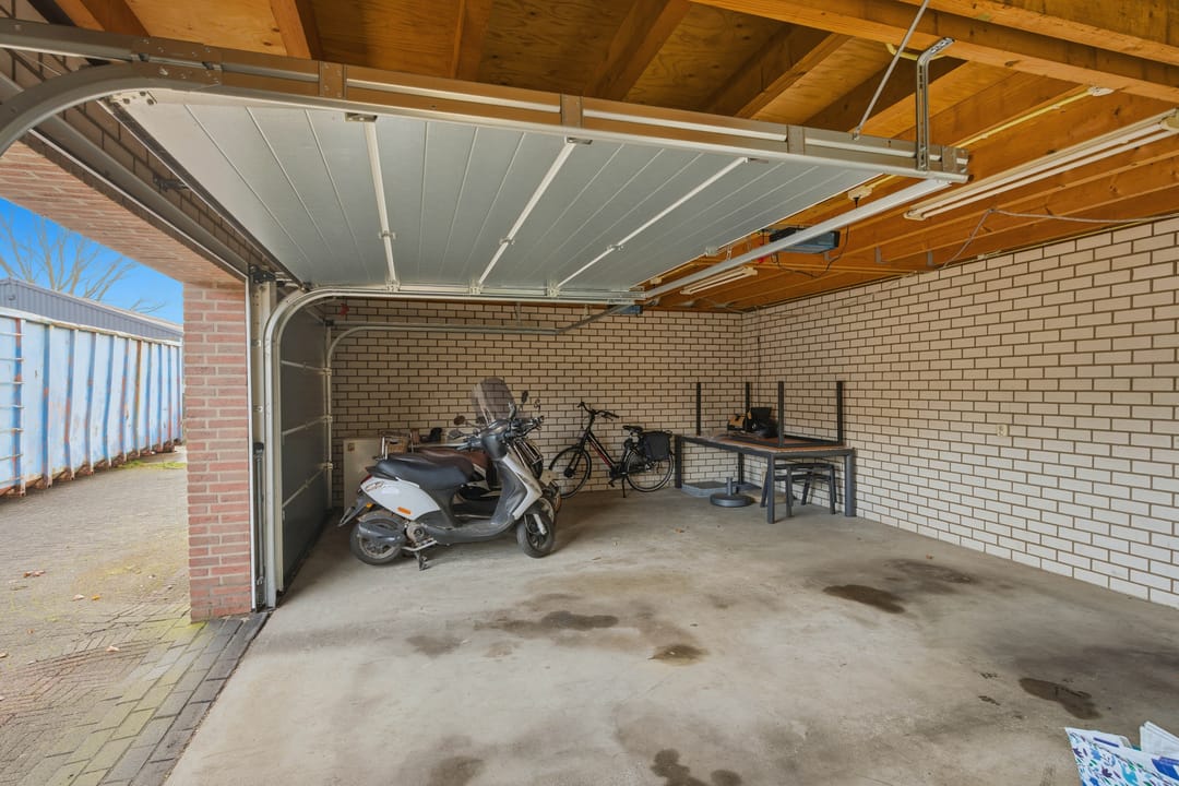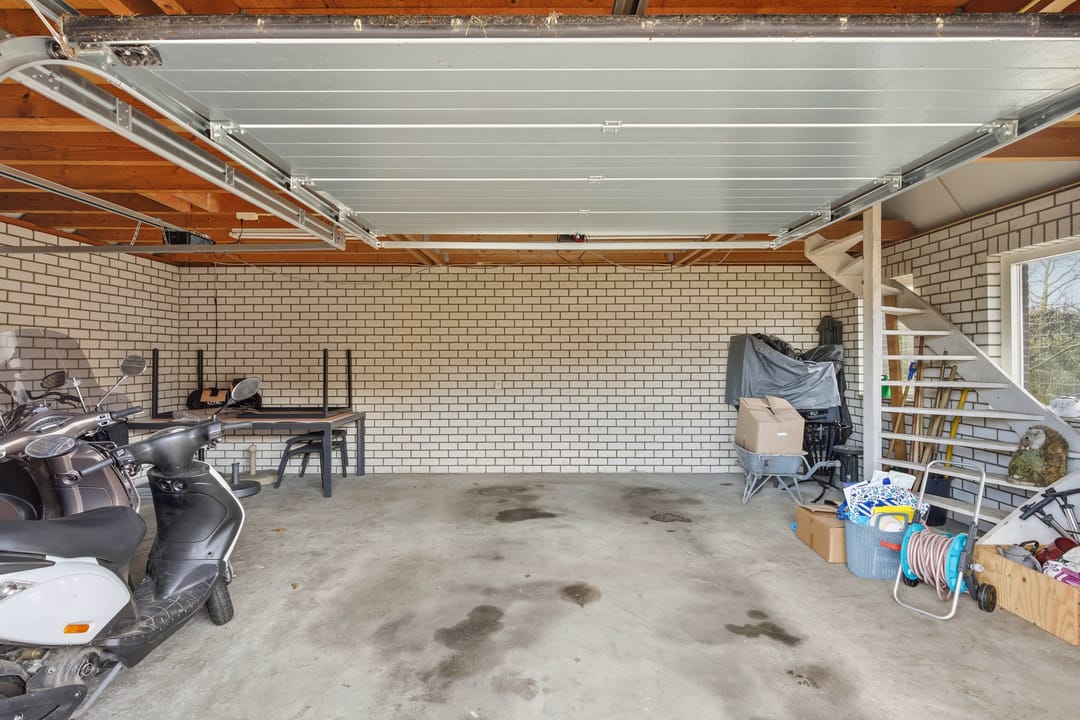 De vrijstaande dubbele garage is gebouwd in 2000 en beschikt over een zolderverdieping, bereikbaar via een vaste trap. Ideaal voor opslag, hobbyruimte of aanvullende werkruimte.