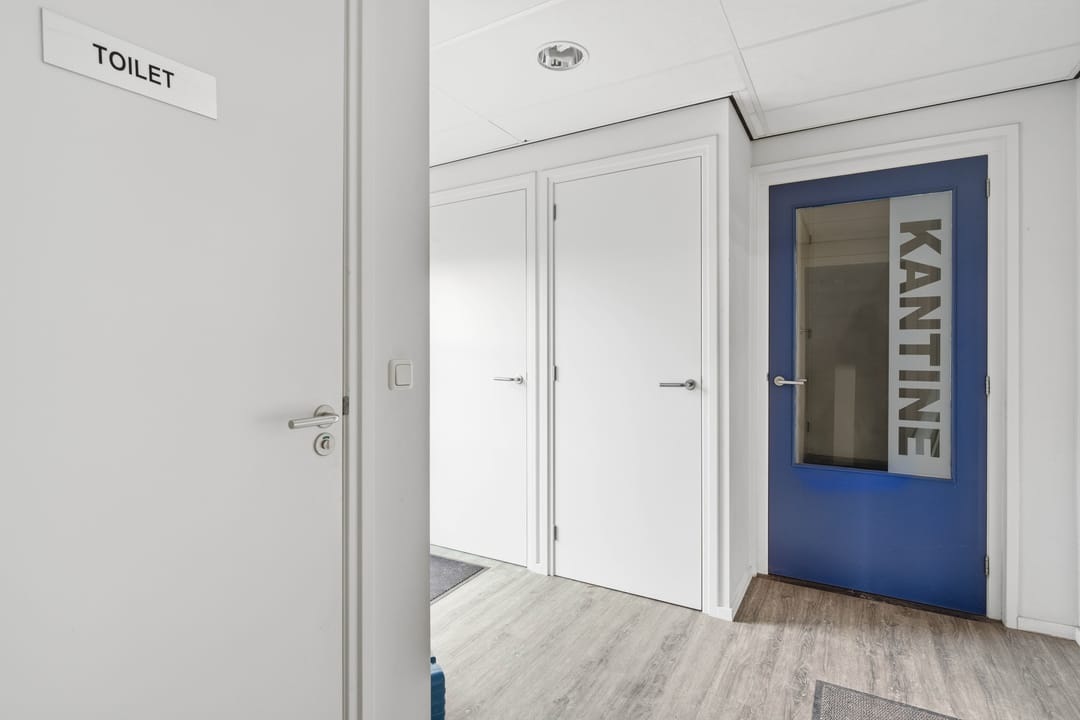 Hal, toilet, kantoor, meterkast, berging, kantine.