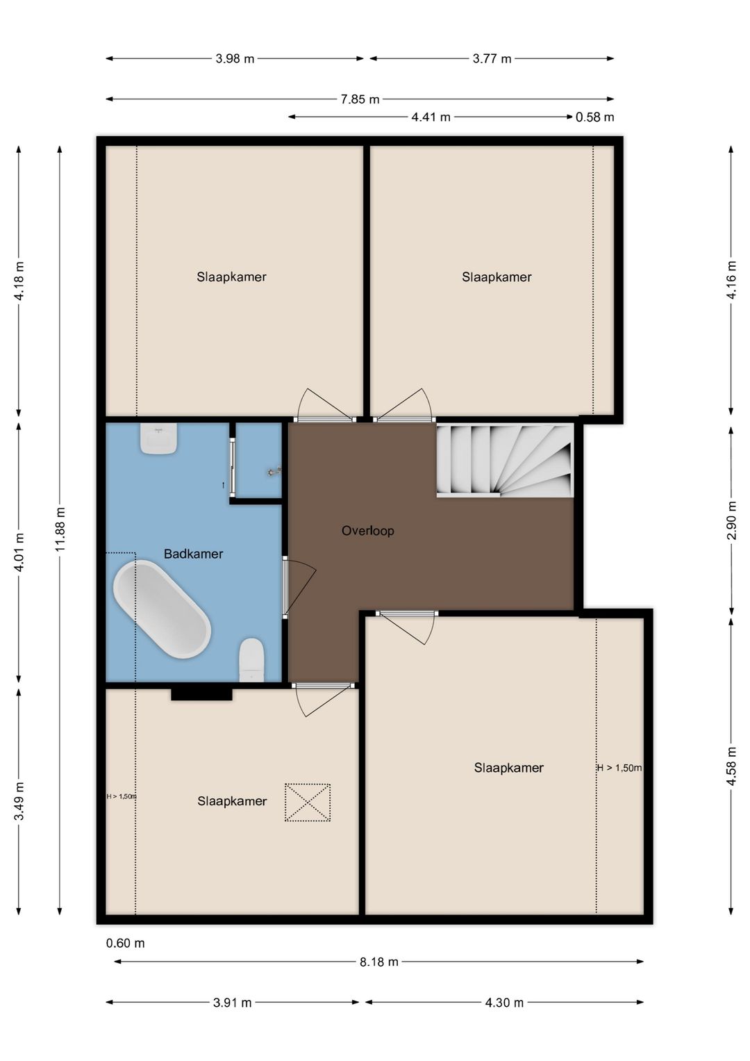 Royale overloop, vier ruime slaapkamers, luxe badkamer (2018) met: vrijstaand ligbad, inloopdouche, hangend closet, wastafelmeubel, vloerverwarming. Zeer moderne en hoogwaardige afwerking.