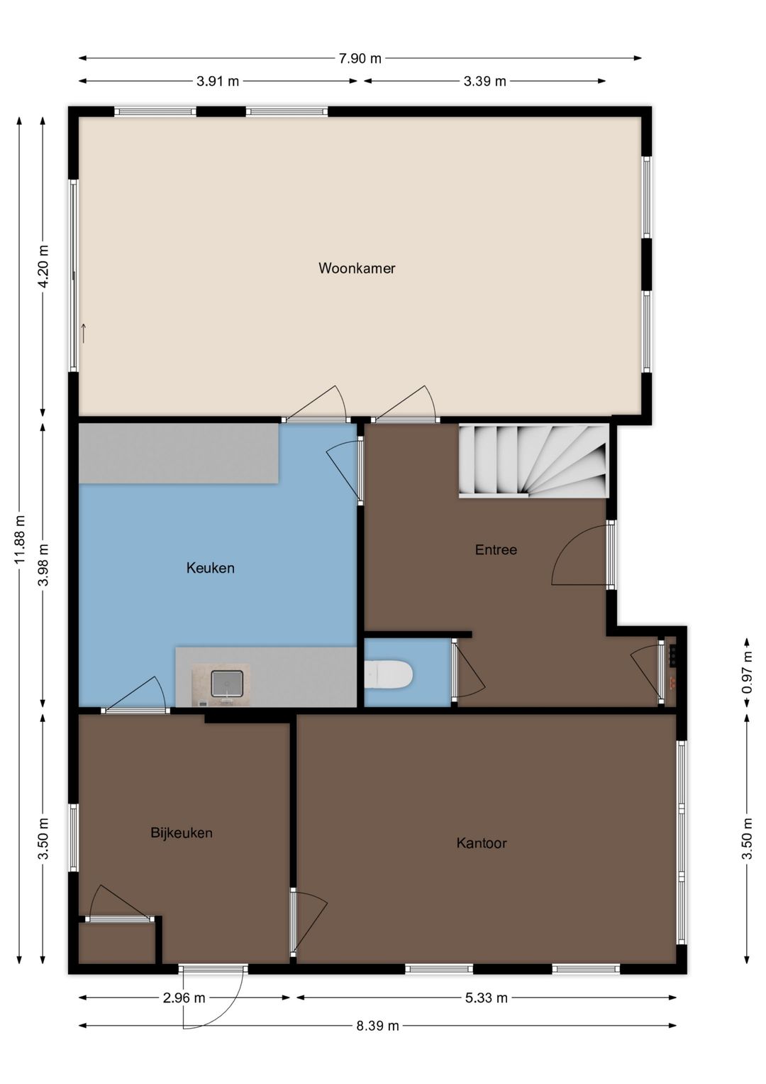 - Inpandige kantoorruimte met eigen entree, bestaande uit: