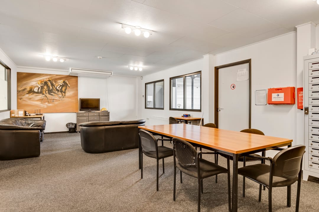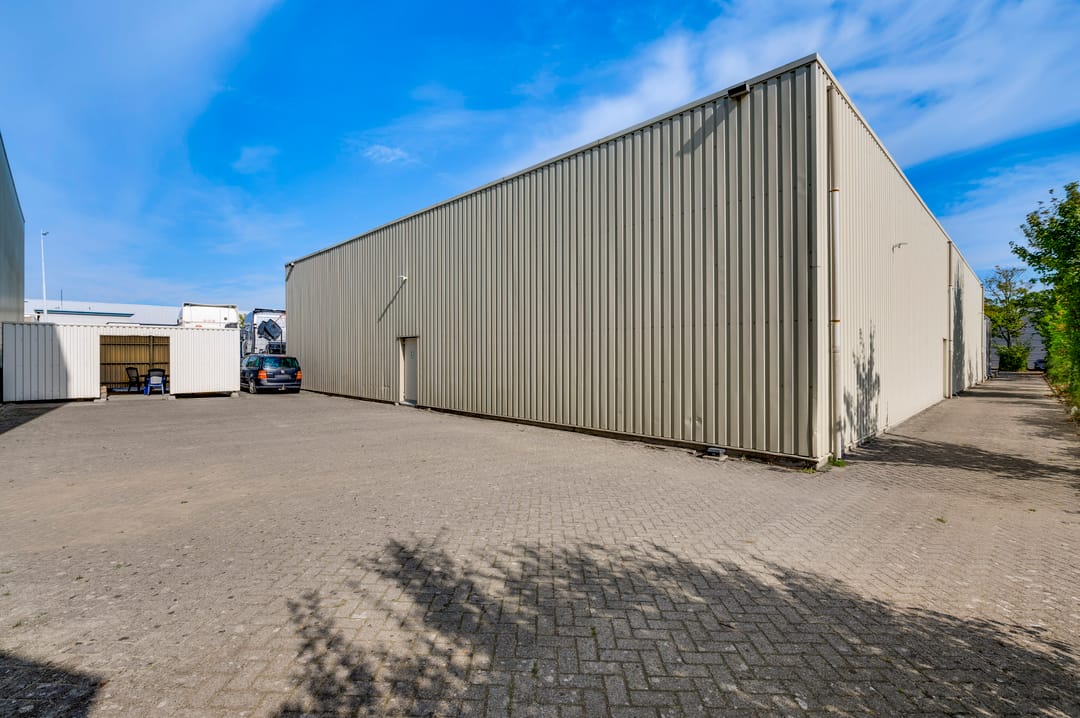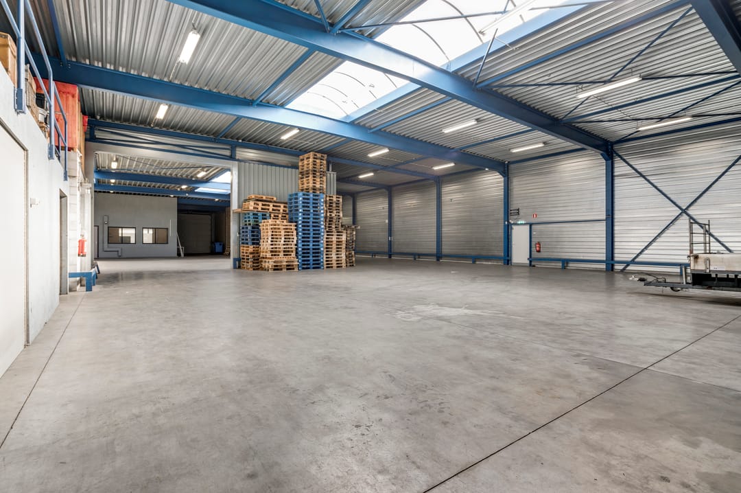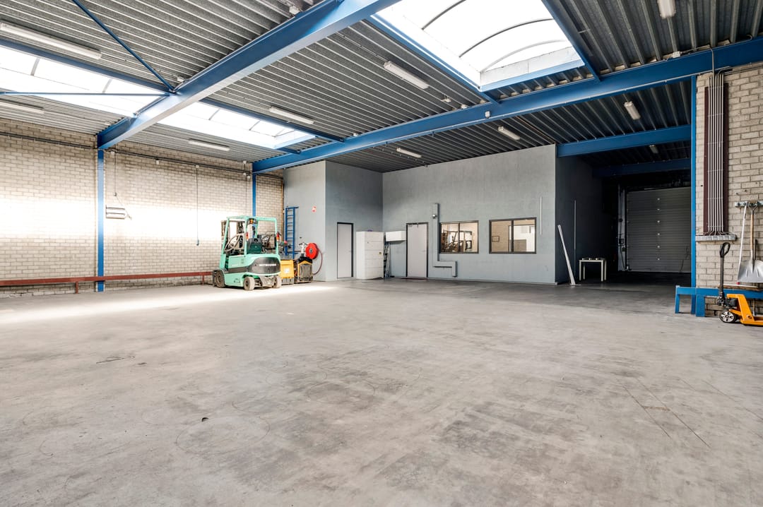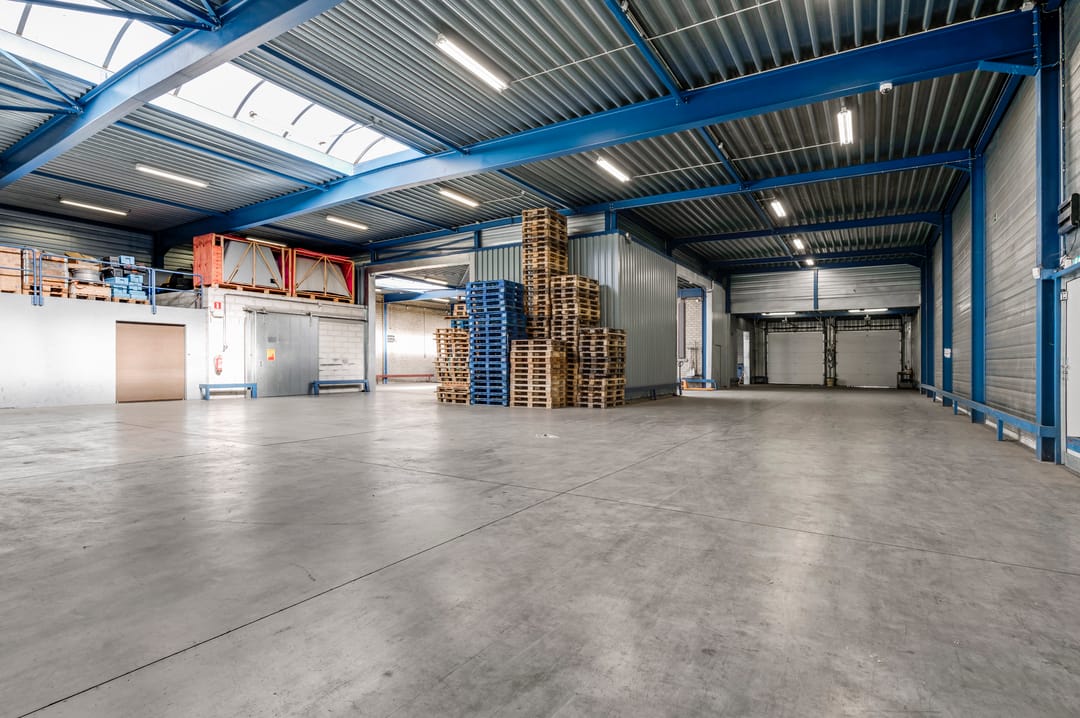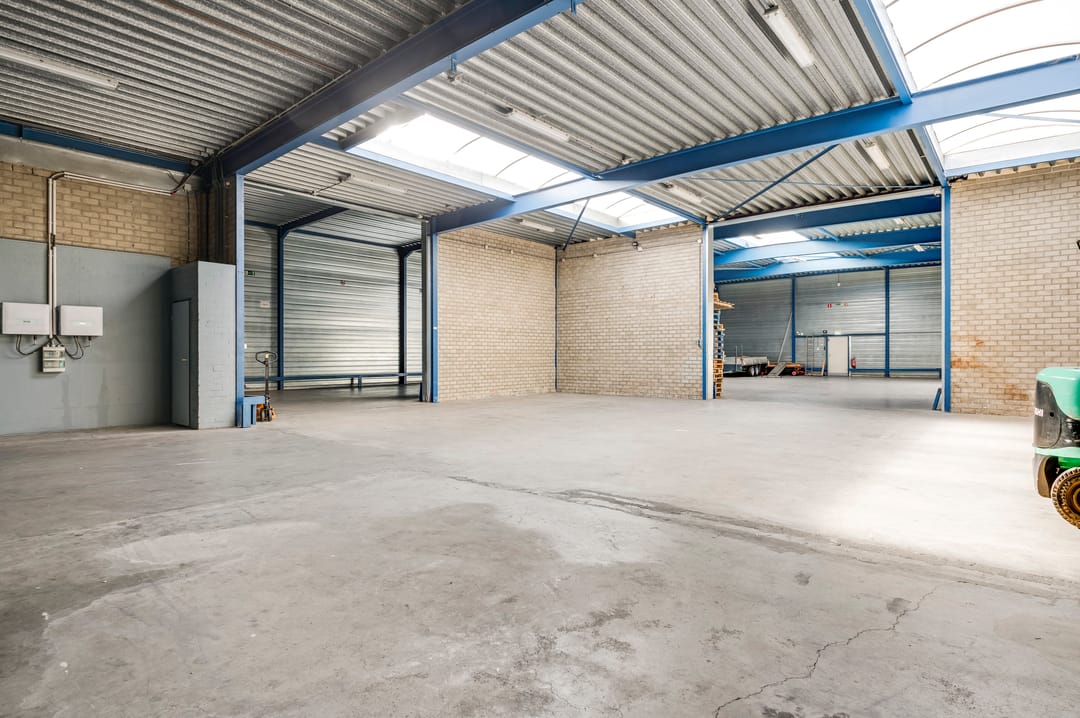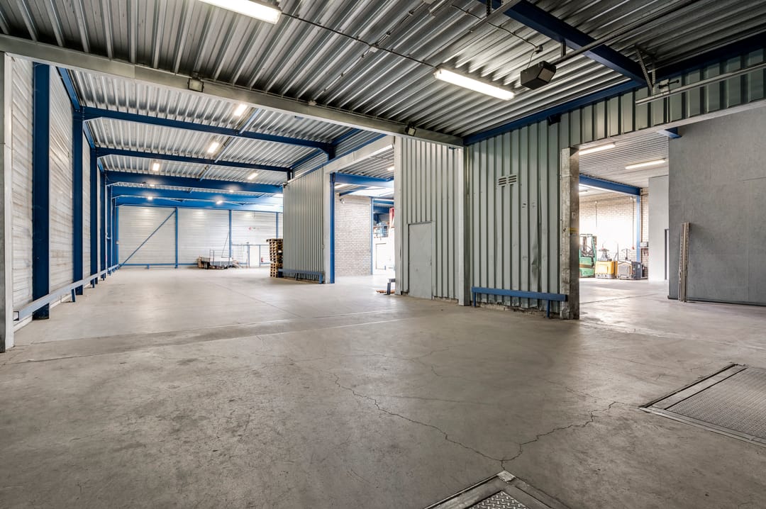 Vanuit de kantine is de bedrijfsruimte bereikbaar. Deze hal is door de jaren heen in verschillende fases uitgebreid, waardoor er diverse hoogtes aanwezig zijn. De hal beschikt over drie lichtstraten die zorgen voor een prettige hoeveelheid daglicht. Aan de achterzijde bevindt zich een entresolvloer die extra opslagcapaciteit biedt.