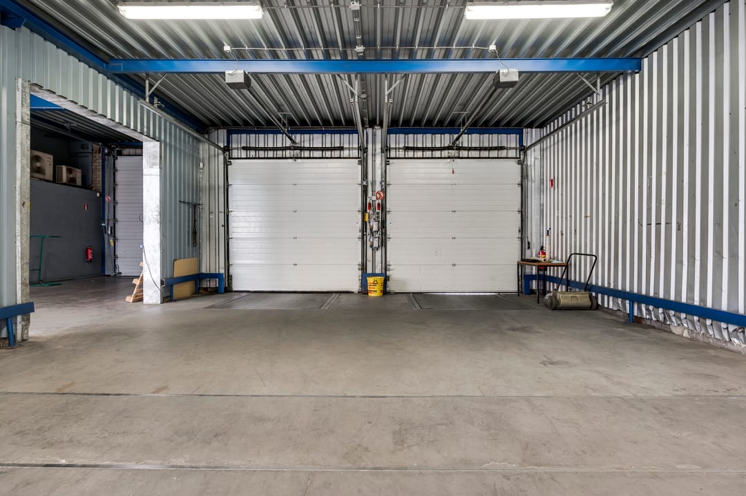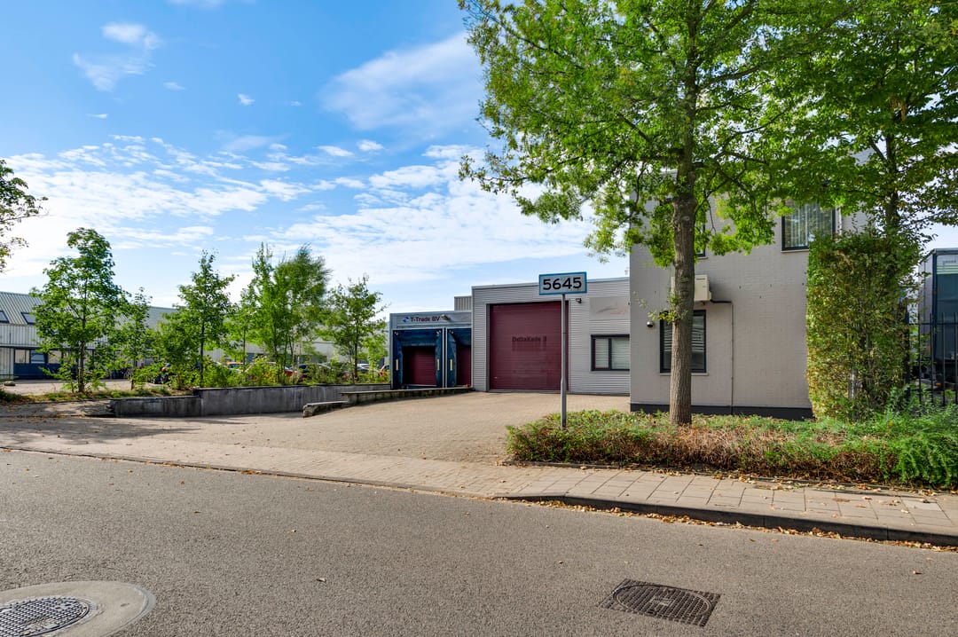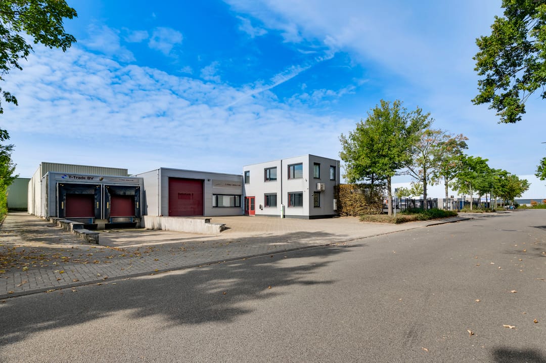 Aan de voorzijde is de bedrijfsruimte toegankelijk via een grote rolpoort en twee laaddocks met dock levellers, wat zorgt voor een efficiënte goederenstroom.