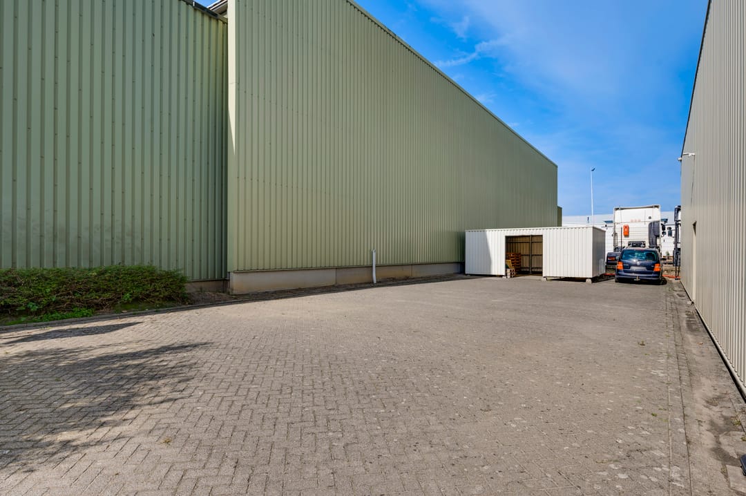 Het terrein is nagenoeg geheel verhard, omheind en voorzien van beveiliging. Parkeren kan zowel aan de voorzijde van het pand als op het achtergelegen terrein, dat via een eigen inrit aan de linkerzijde bereikbaar is. Het achter terrein biedt bovendien mogelijkheden voor buitenopslag, hier bevindt zich tevens een fietsenberging.