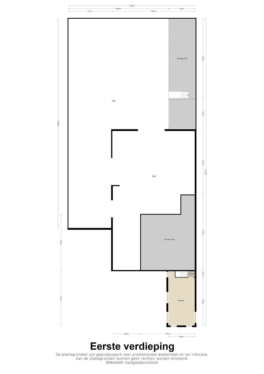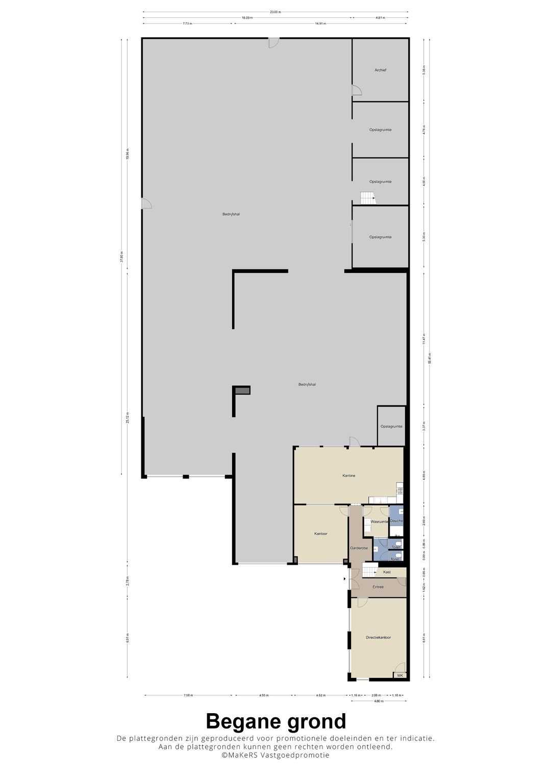 De bedrijfsruimte kan eenvoudig uitgebreid worden met ca. 100 m² door het laten wegvallen van één kantoor en de kantine/personeelsruimte, mocht de gebruiker minder kantoorruimte nodig hebben.
