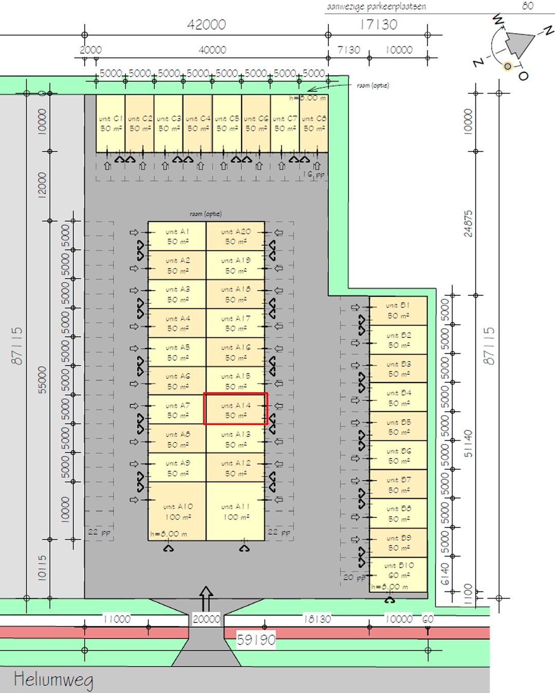 De unit heeft een begane-grondoppervlak van circa 10 x 5 meter en een verdiepingsvloer van eveneens circa 10 x 5 meter. Hierdoor heeft u een bruikbaar vloeroppervlak van circa 100 m². De hoogte van het gebouw is 7,4 meter.