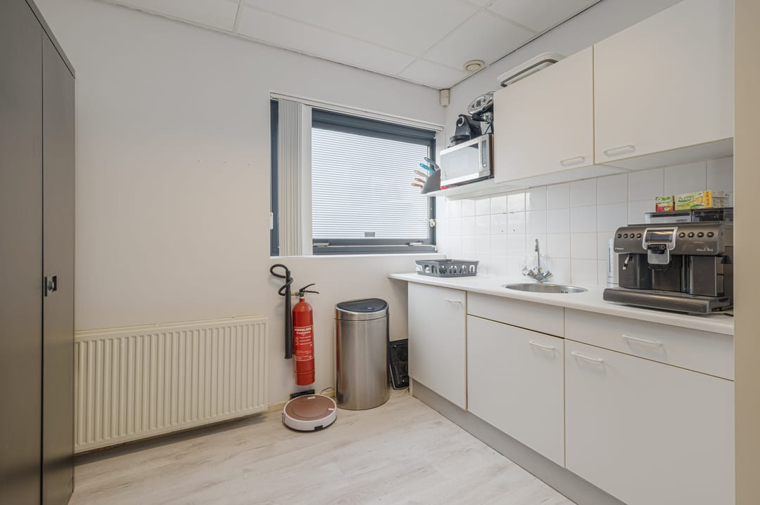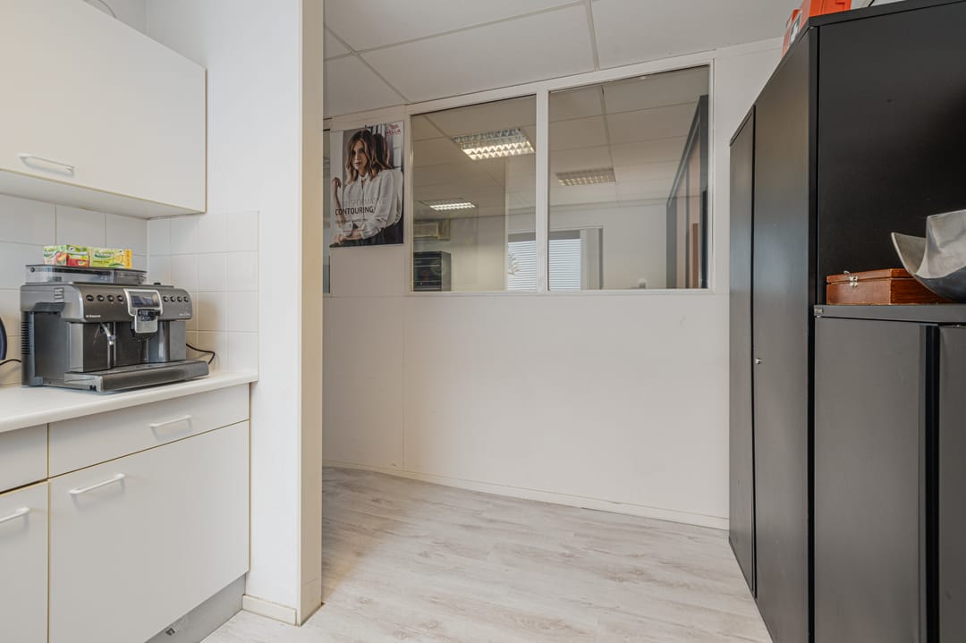 Overloop met toegang tot de kantoorruimte van in totaal ca. 59m2 verdeeld over een vergaderruimte van ca. 19m2 met vaste kast en een kantoorruimte aan de voorzijde. Grote raampartij aan de voorzijde van het kantoor met te openen ramen. De pantry is gelegen aan de zijkant en vanwege de hoekligging extra lichtinval. De ruimte is voorzien van diverse elektra punten en kan worden verwarmd middels radiatoren.