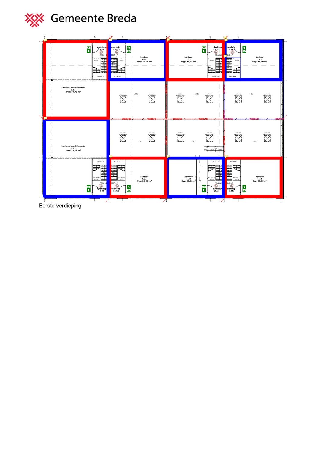 1e verdieping ca. 41 m²: kantoor 5.30 m diep x 7.85 m breed x 2.65 m hoog.