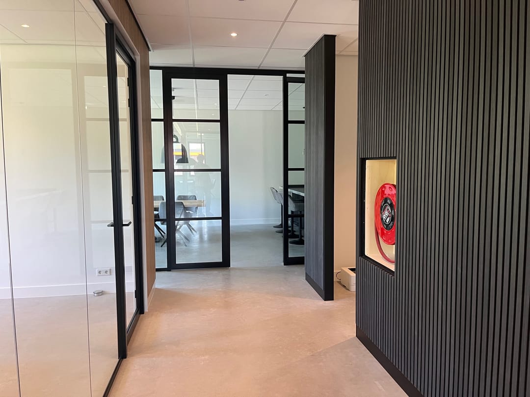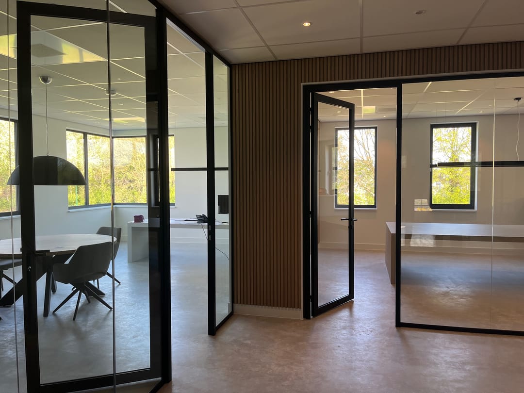 De kantoorruimte is verdeeld over 2 bouwlagen en kan op wens van de huurder "op maat" worden afgebouwd. De foto's van de afgebouwde kantoorruimten zijn van het naastgelegen gebouw en dienen als referentie/voorbeeld.