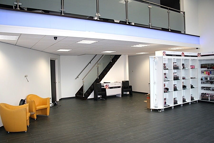 Kantoor/receptie (92 m²) met vide, toiletgroep (18 m²) met een voorportaal met dubbele wastafel met meubel, urinoir, 2 toiletten en één invalidentoilet, royale bedrijfshal (545 m²) met 2 elektrisch bedienbare sectionaalpoorten en een heater.