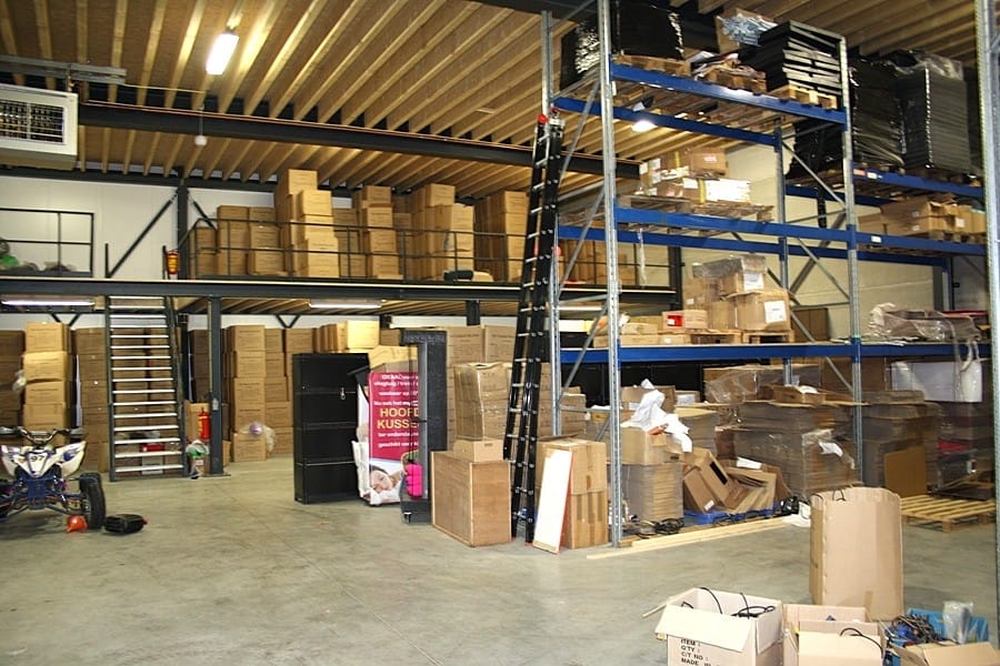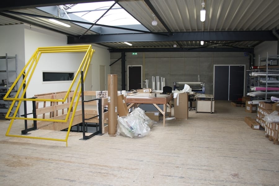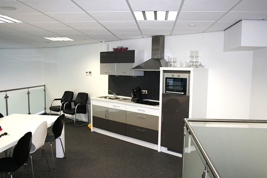 Mooie kantine (25 m²) met een luxe aanbouwkeuken v.v. alle apparatuur, kantoor (20 m²), opslagruimte (35 m²) en een magazijn (93 m²).
