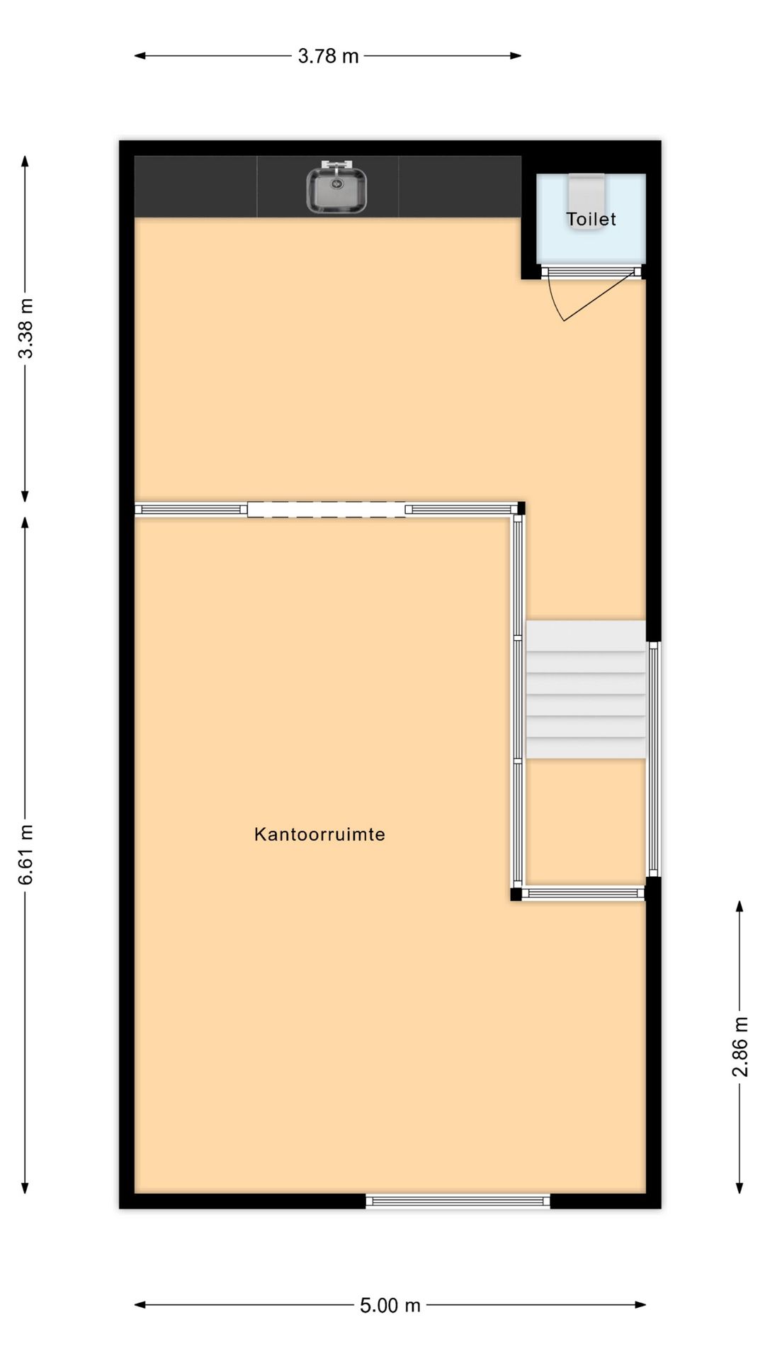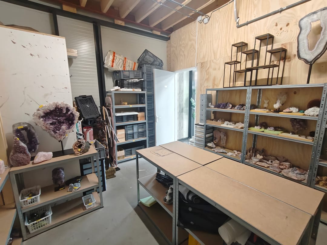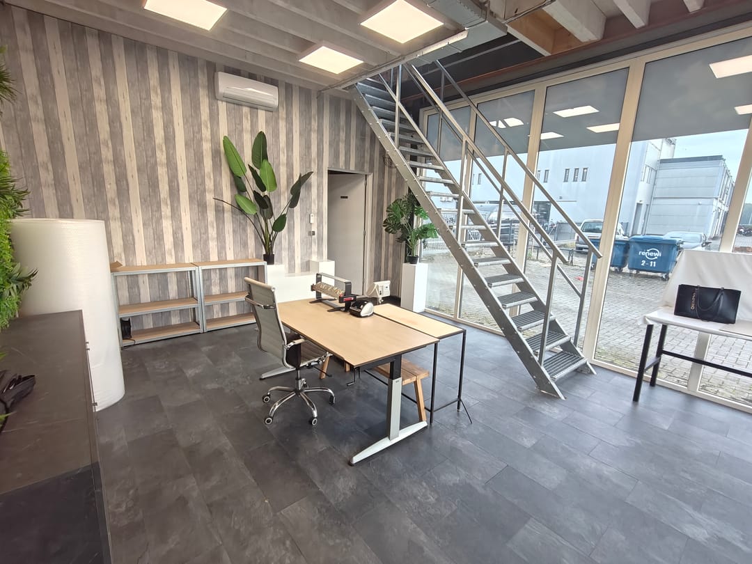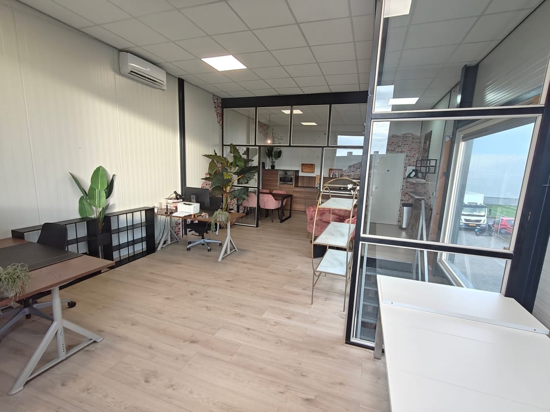 Entree met toegang tot de showroom met achtergelegen opslagruimte, trapopgang naar verdieping. Op de verdieping bevindt zich een kantoor met kamerindeling, een toilet en een keuken.