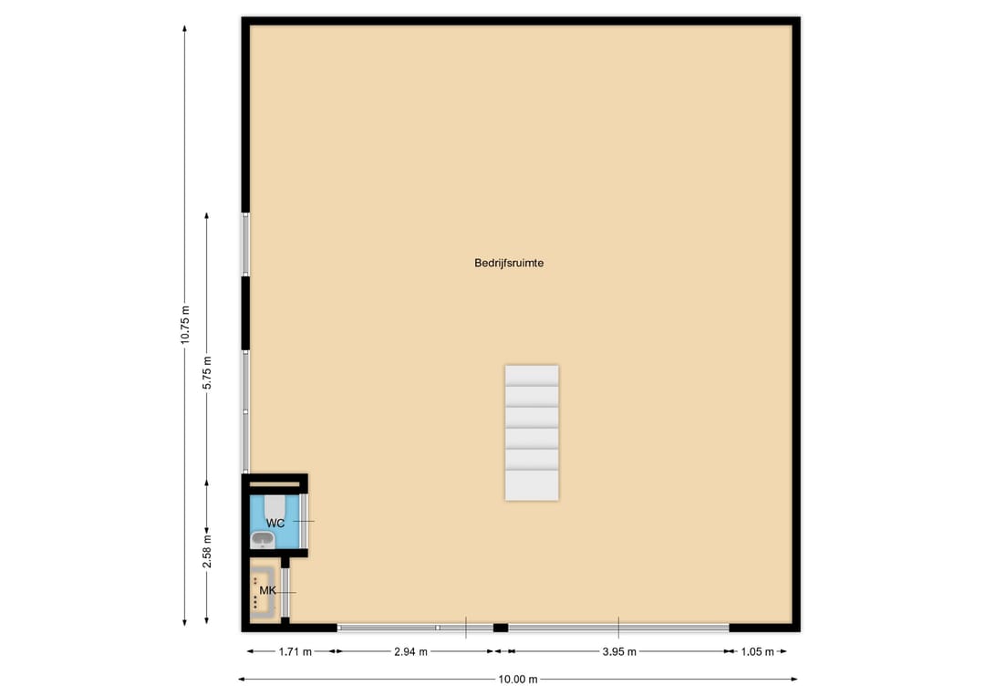 - Monolithische betonvloer (1.000 kg/m² draagvermogen)