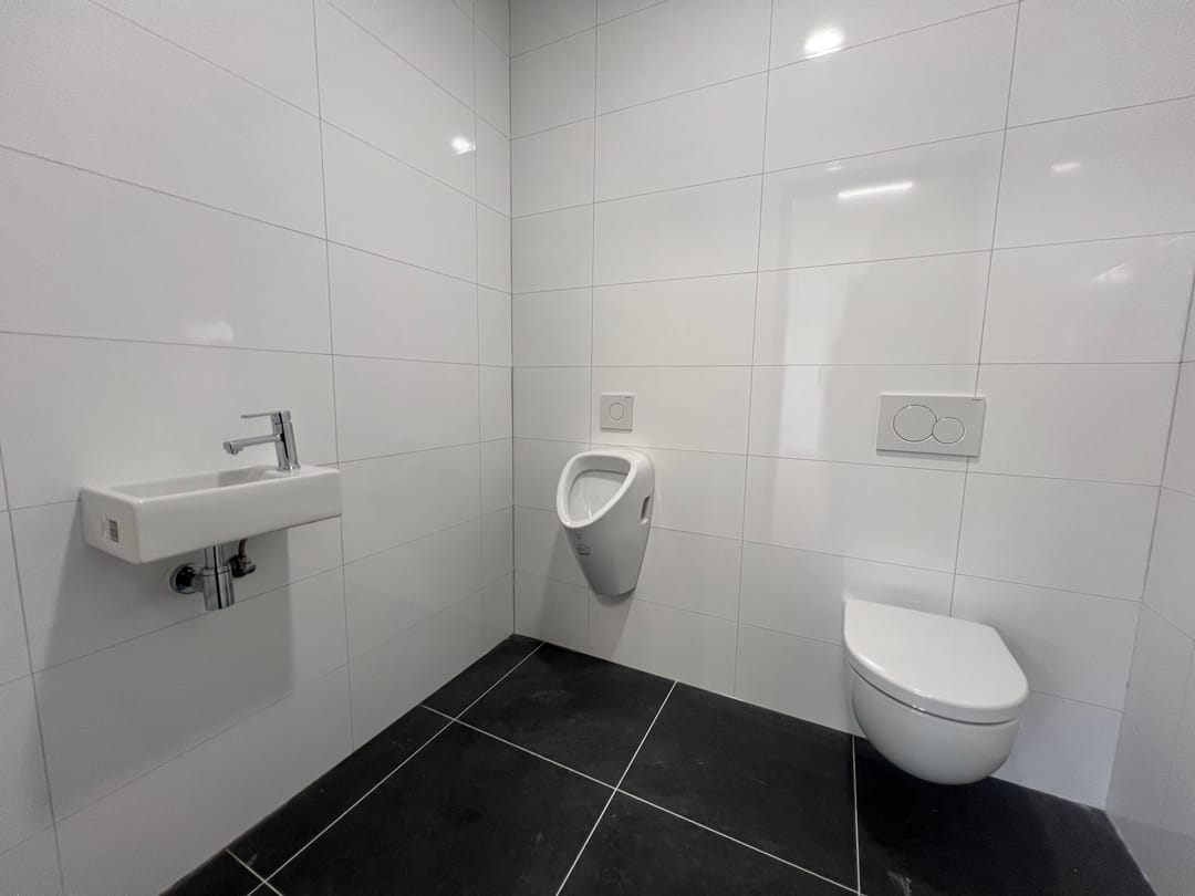- luxe betegelde toiletruimte met wandcloset, fonteintje en mechanische ventilatie.