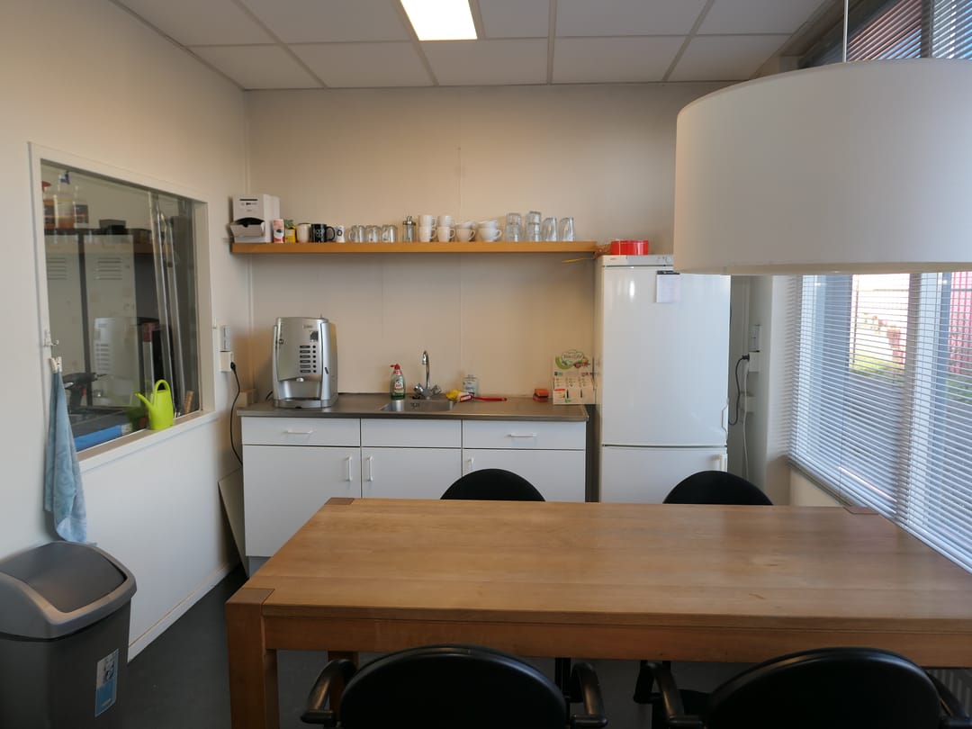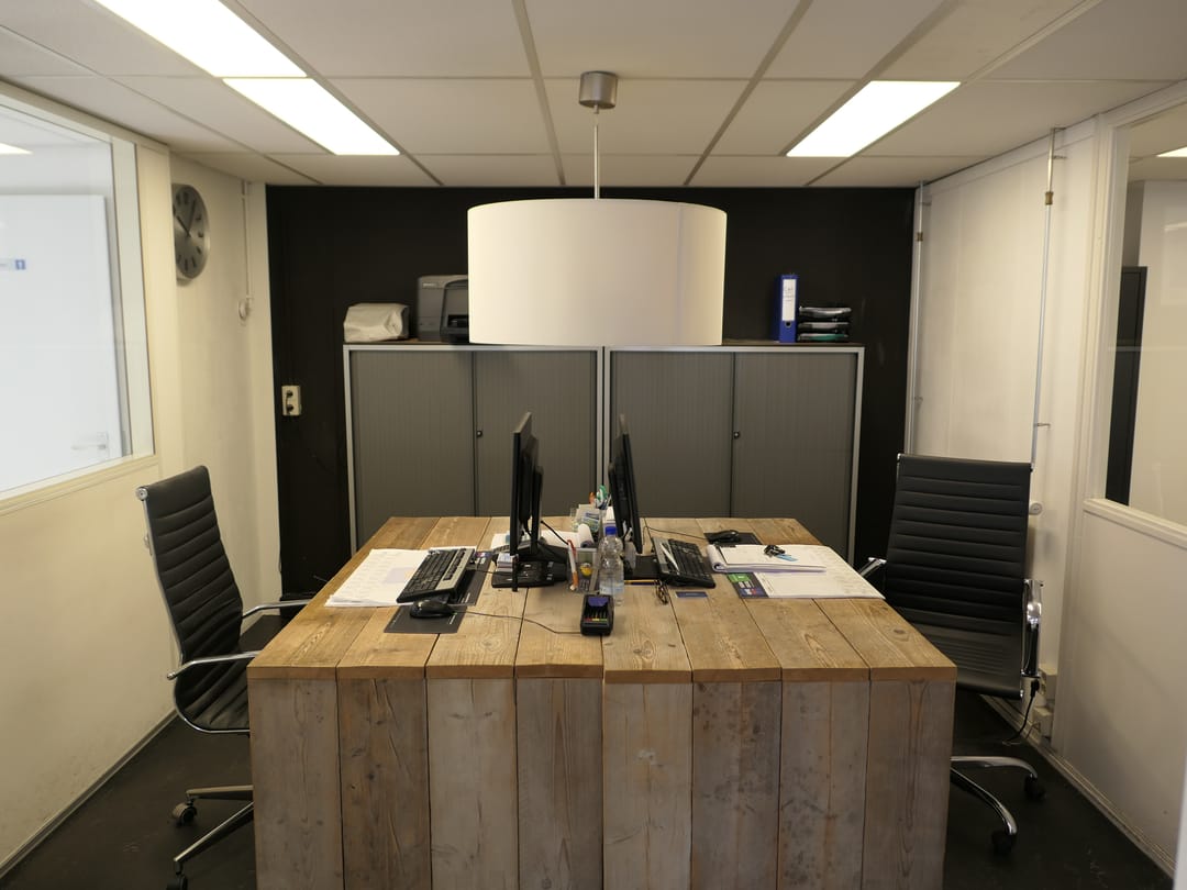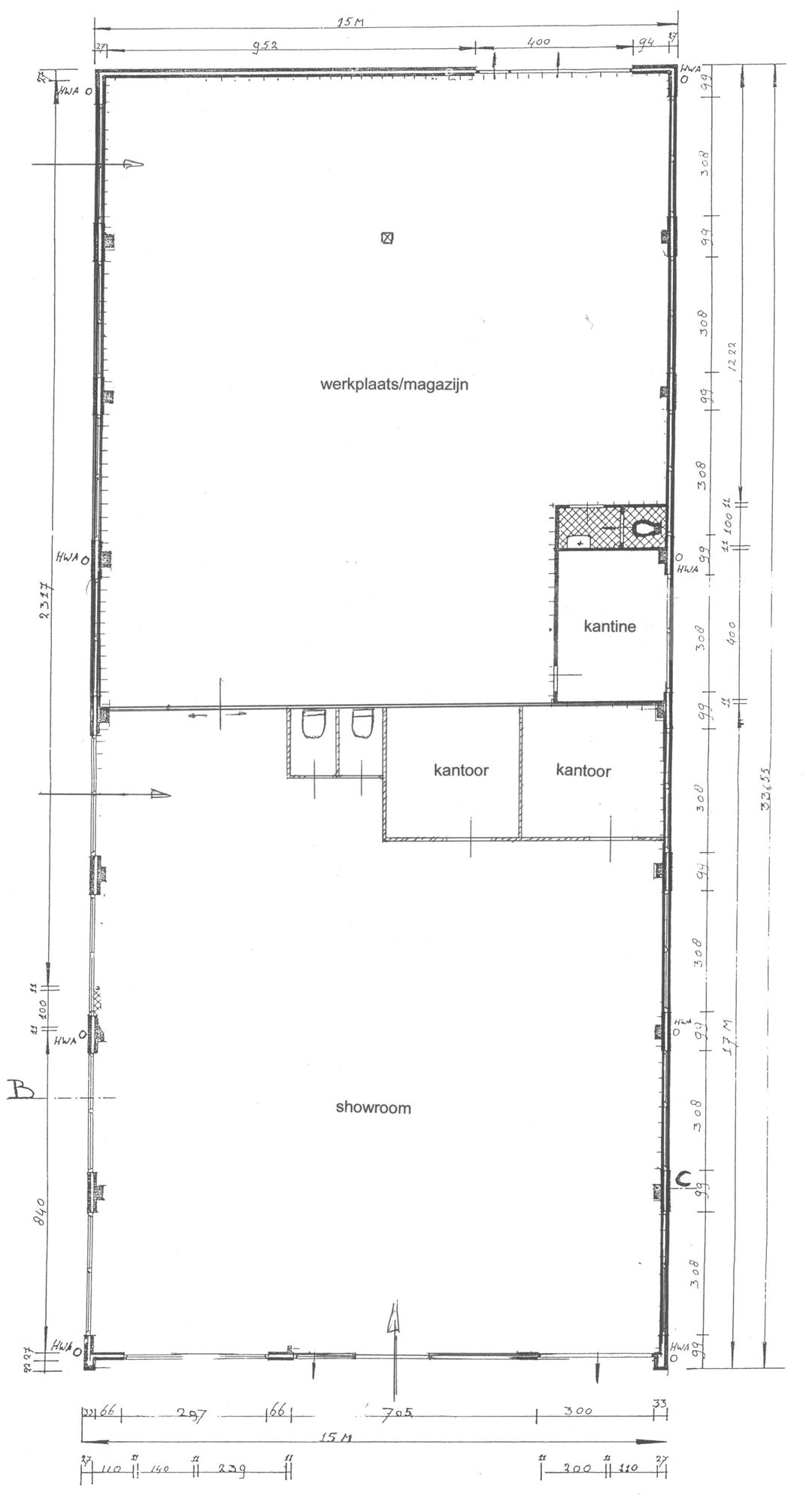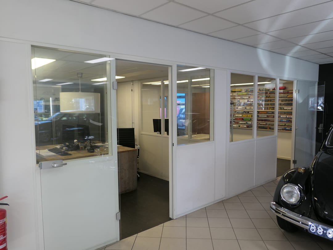 Showroom met 2 kantoren en toiletruimte (toilet en urinoir), werkplaats met toilet en kantine, kleine bergzolder.