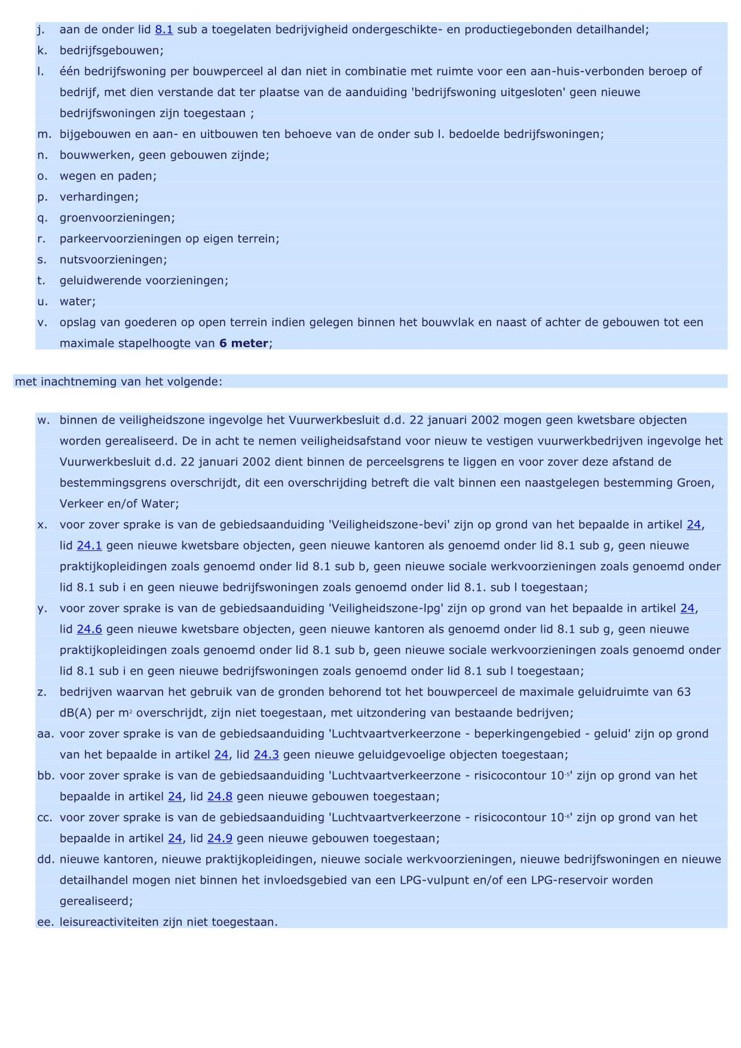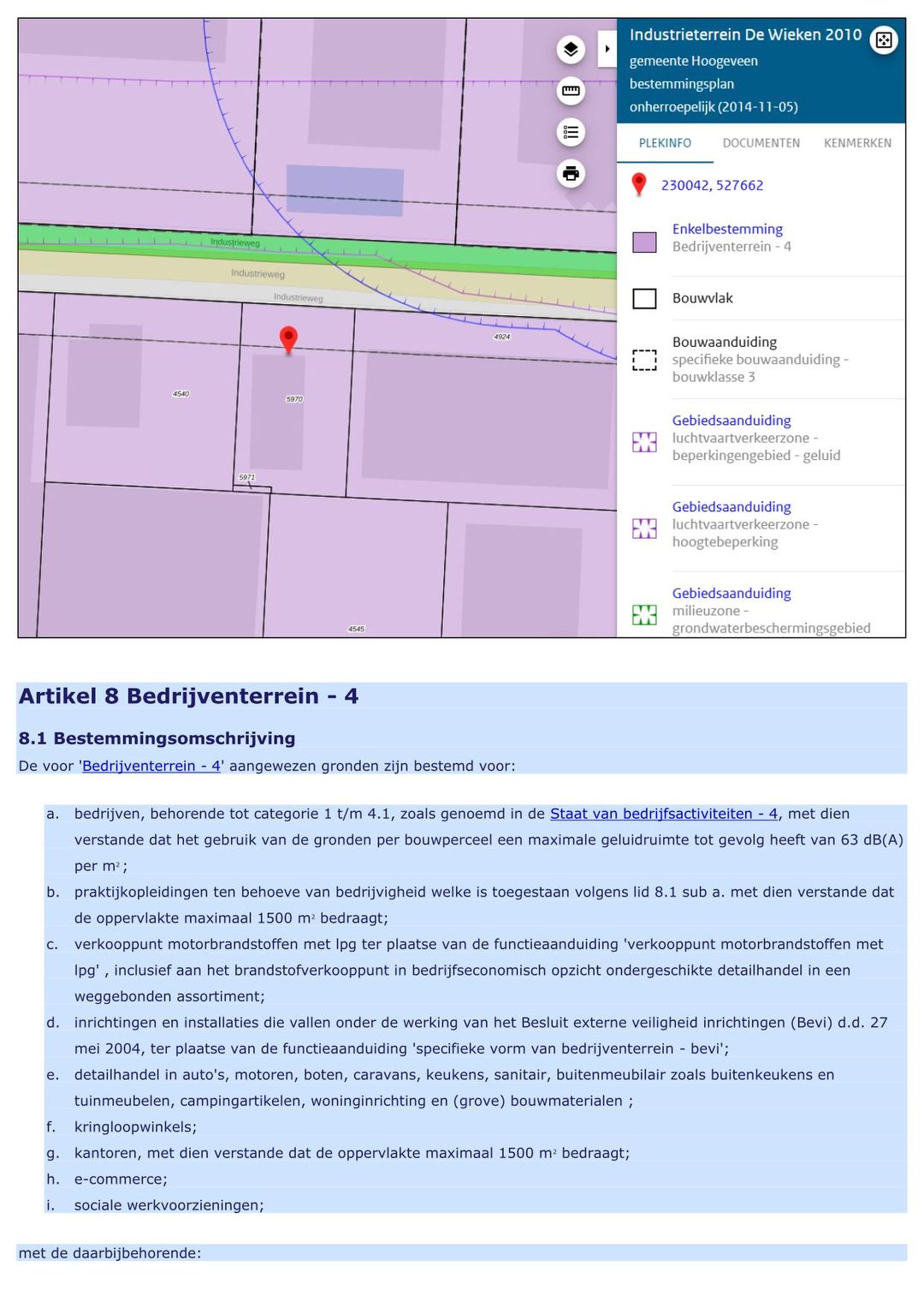 Bestemmingsplan De Wieken 2010, vastgesteld op 5 november 2014. Deze locatie heeft daarin de bestemming Bedrijventerrein-5. De hiervoor aangewezen gronden zijn bestemd voor bedrijven, behorende tot categorie 1 t/m 4.2, zoals genoemd in de Staat van bedrijfsactiviteiten - 5, met dien verstande dat het gebruik van de gronden per bouwperceel een maximale geluidruimte tot gevolg heeft van 64 dB(A) per m², praktijkopleidingen; detailhandel in auto's, motoren, boten, caravans, keukens, sanitair, buitenmeubilair zoals buitenkeukens en tuinmeubelen, campingartikelen, woninginrichting en (grove) bouwmaterialen, kringloopwinkels, e-commerce, kantoren, sociale werkvoorzieningen.