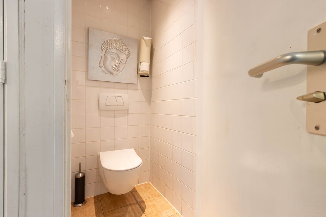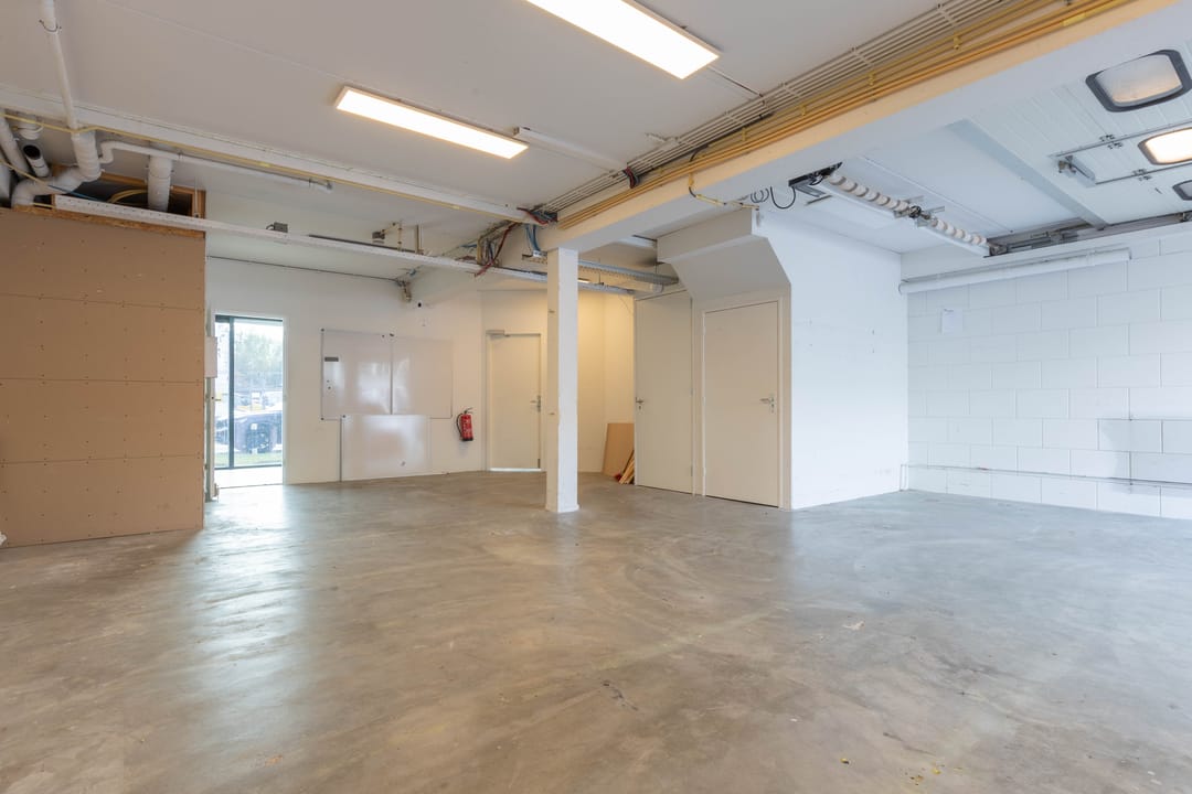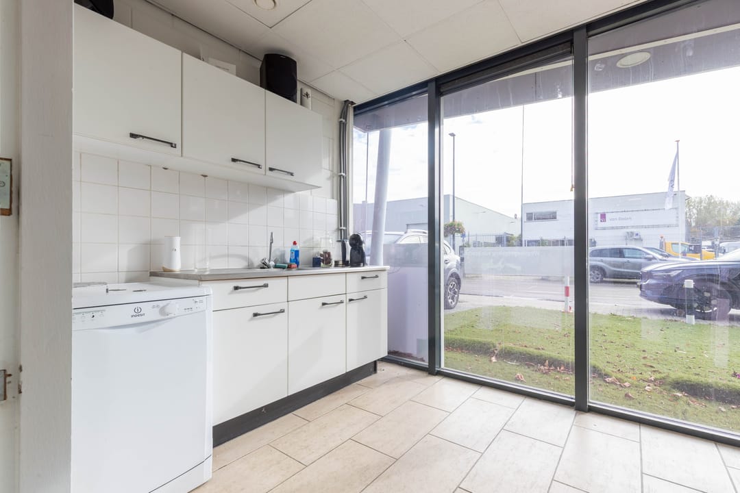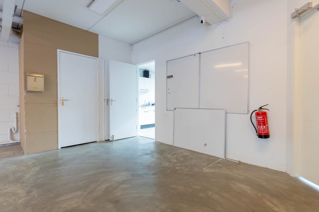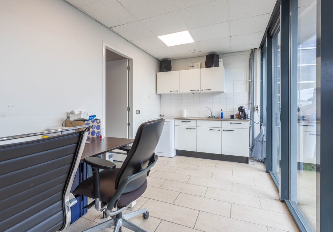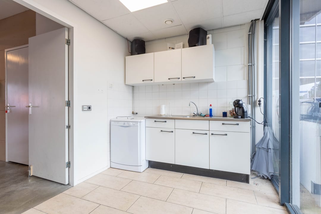 Aan de voorzijde bevindt zich een kantineruimte met keuken, perfect voor pauzes of korte overlegmomenten. Daarnaast is er een toiletruimte aanwezig.
