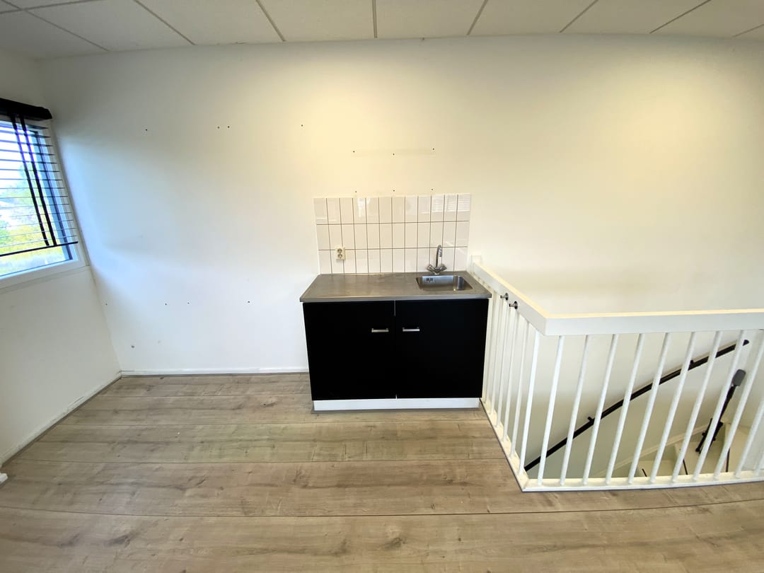 Overloop, kantoorkamer met keukenblok.