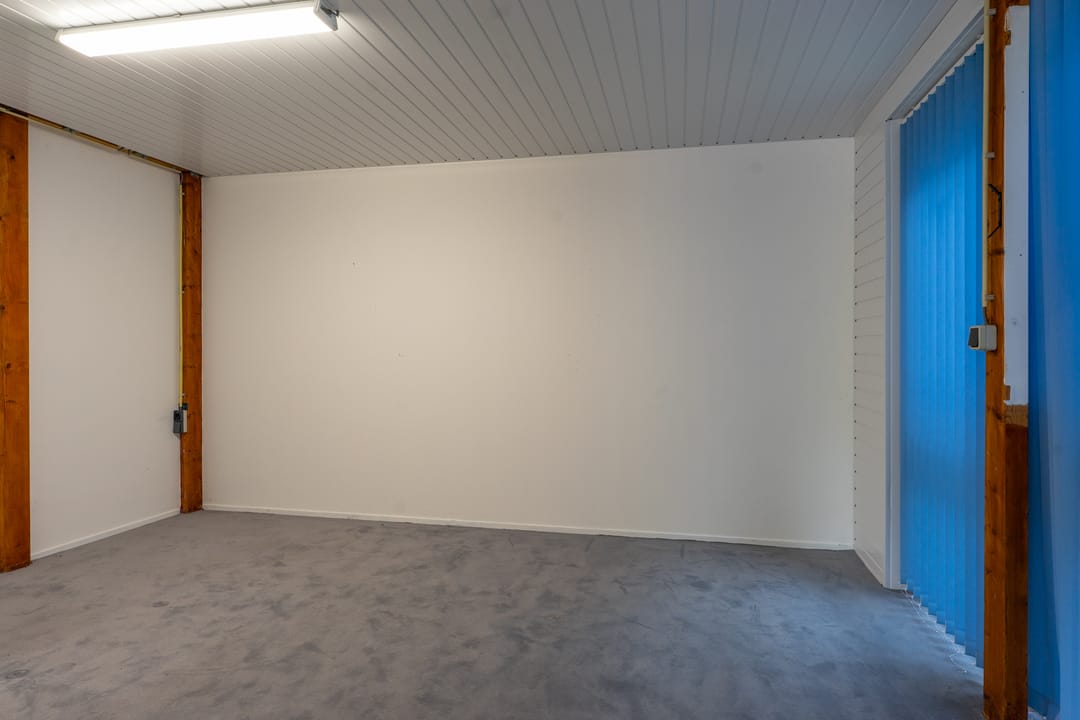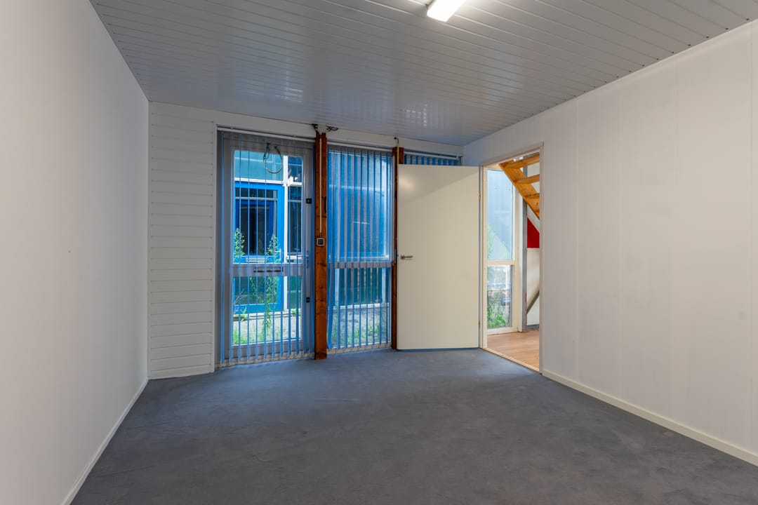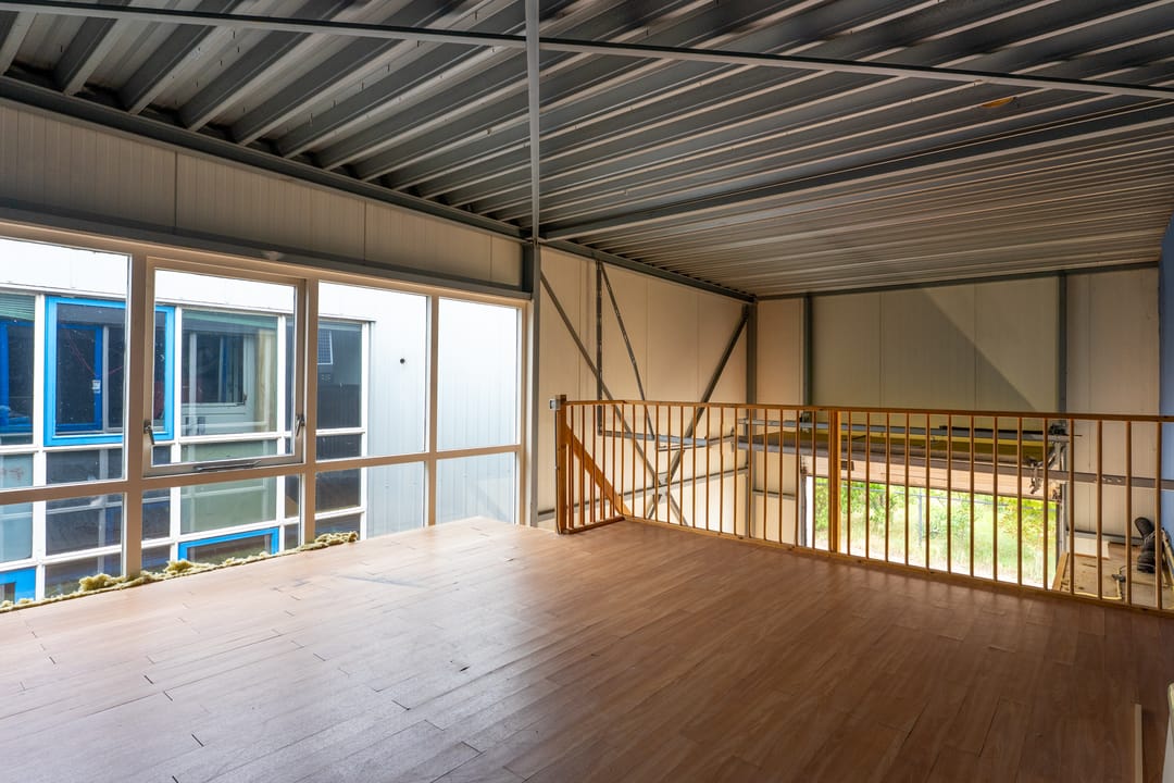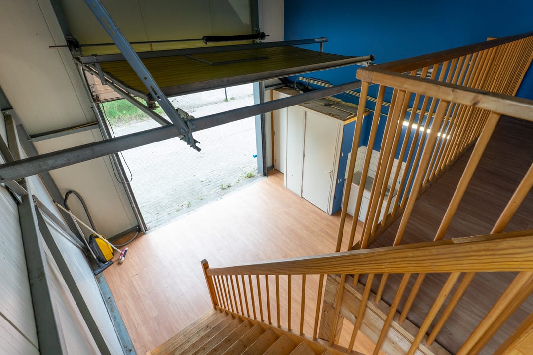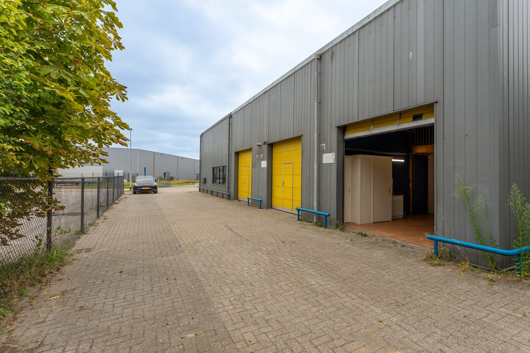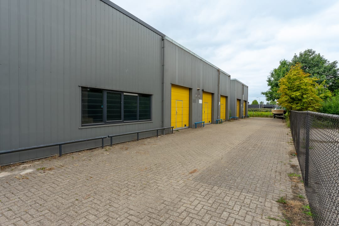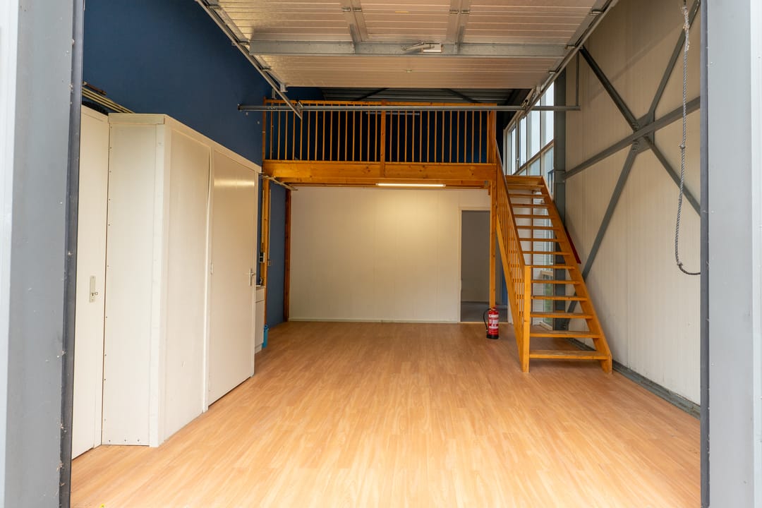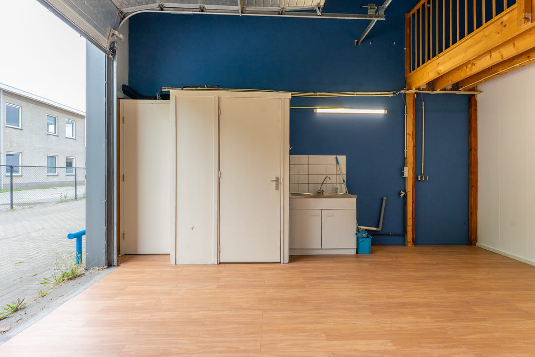 Met een overheaddeur incl. loopdeur. Er is daglicht door een glaspui aan de zijkant van de unit, waar nog een tweede loopdeur met brievenbus is. De unit heeft een toilet, keukenblok en zelfstandige gas/water/elektra-aansluitingen.