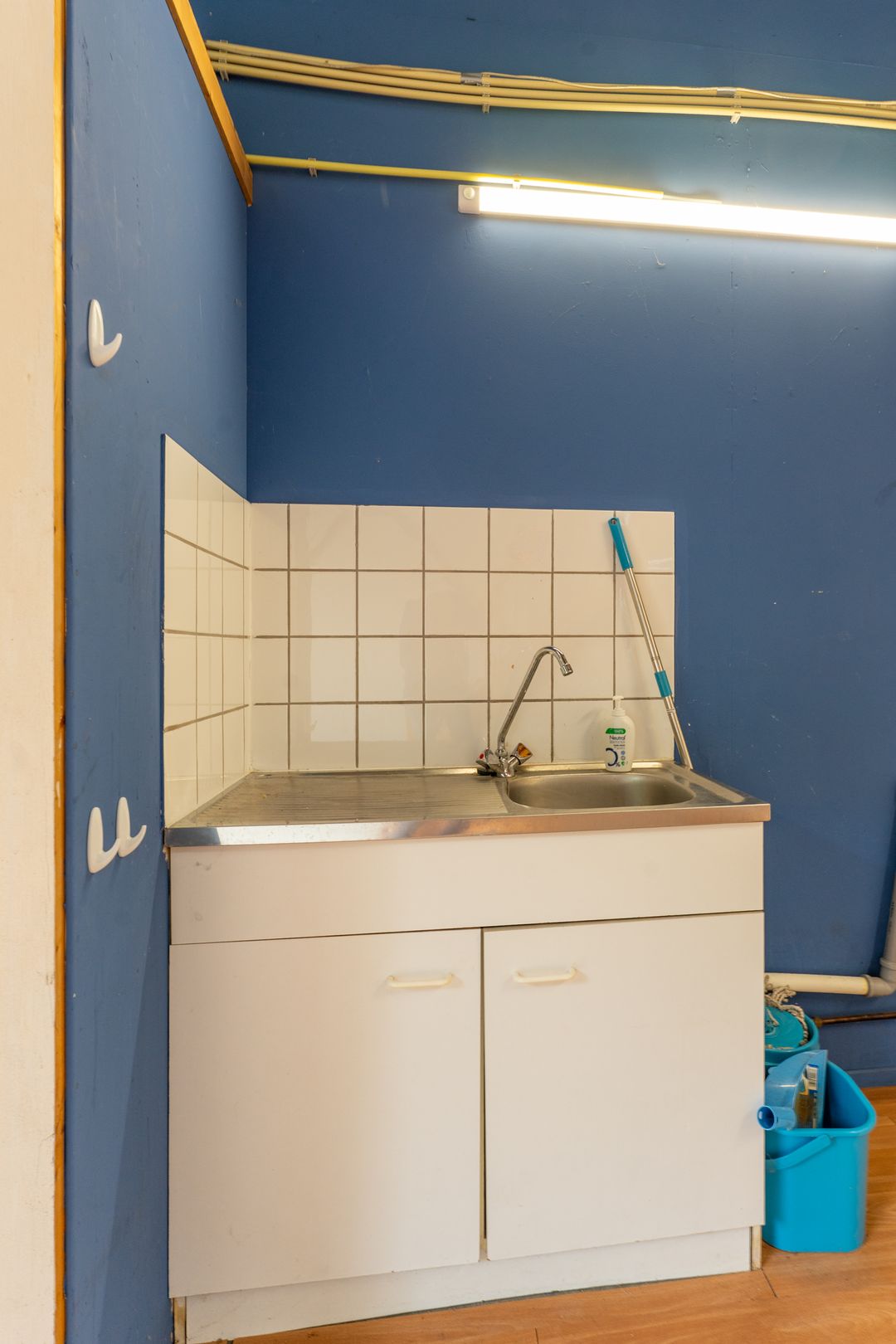 De hal is circa 45 m² groot, met nog eens circa 22,5 m² op de verdieping (entresol). De hal heeft een betonvloer (met laminaat) en er is een toilet en keukenblok.