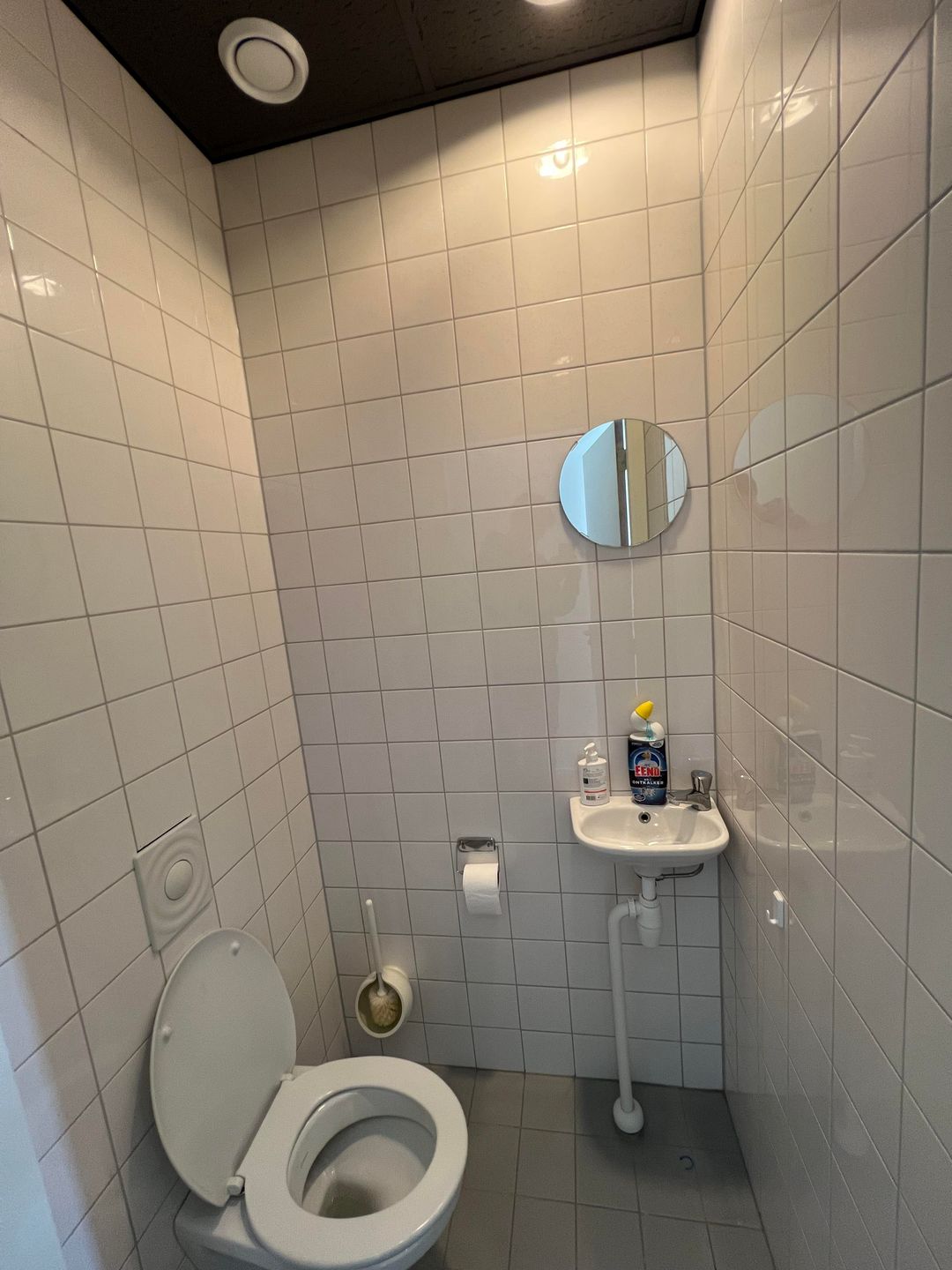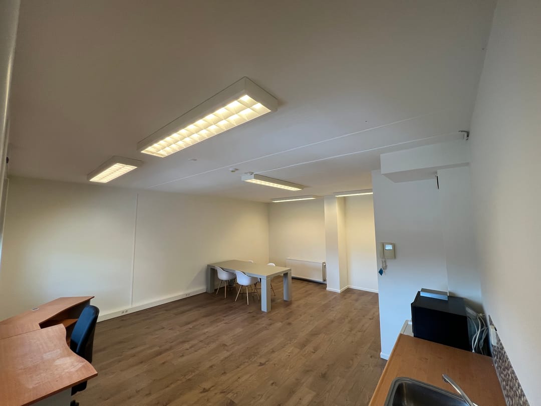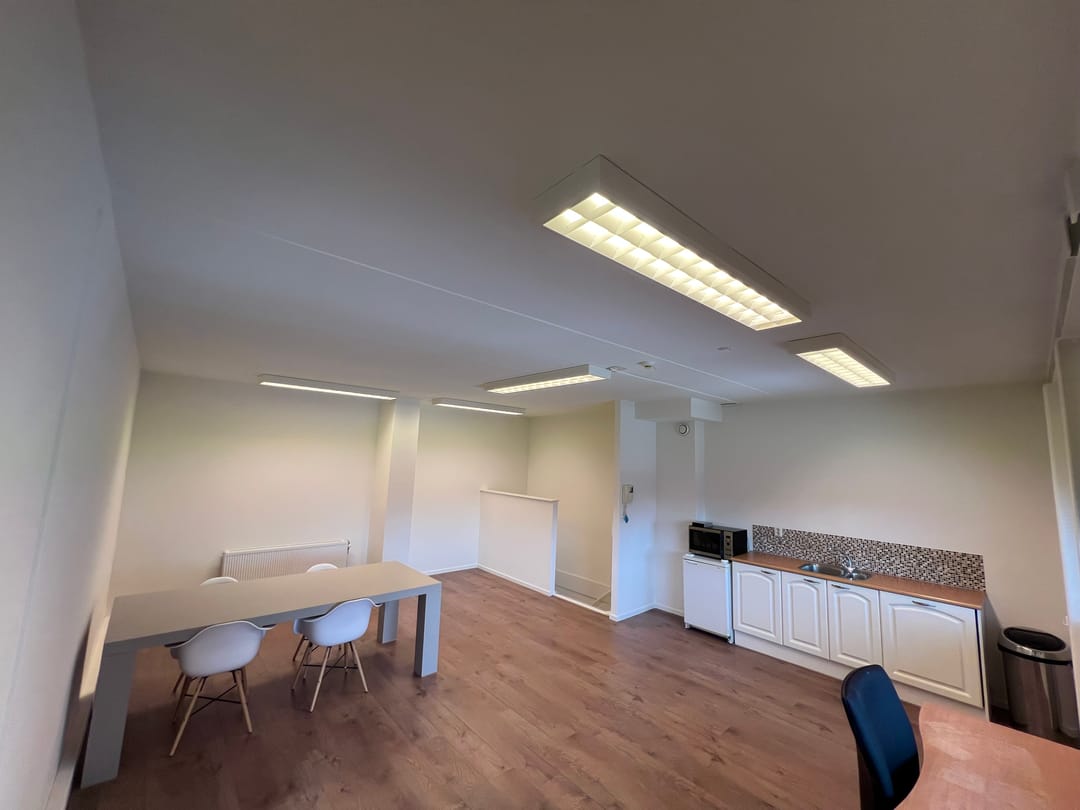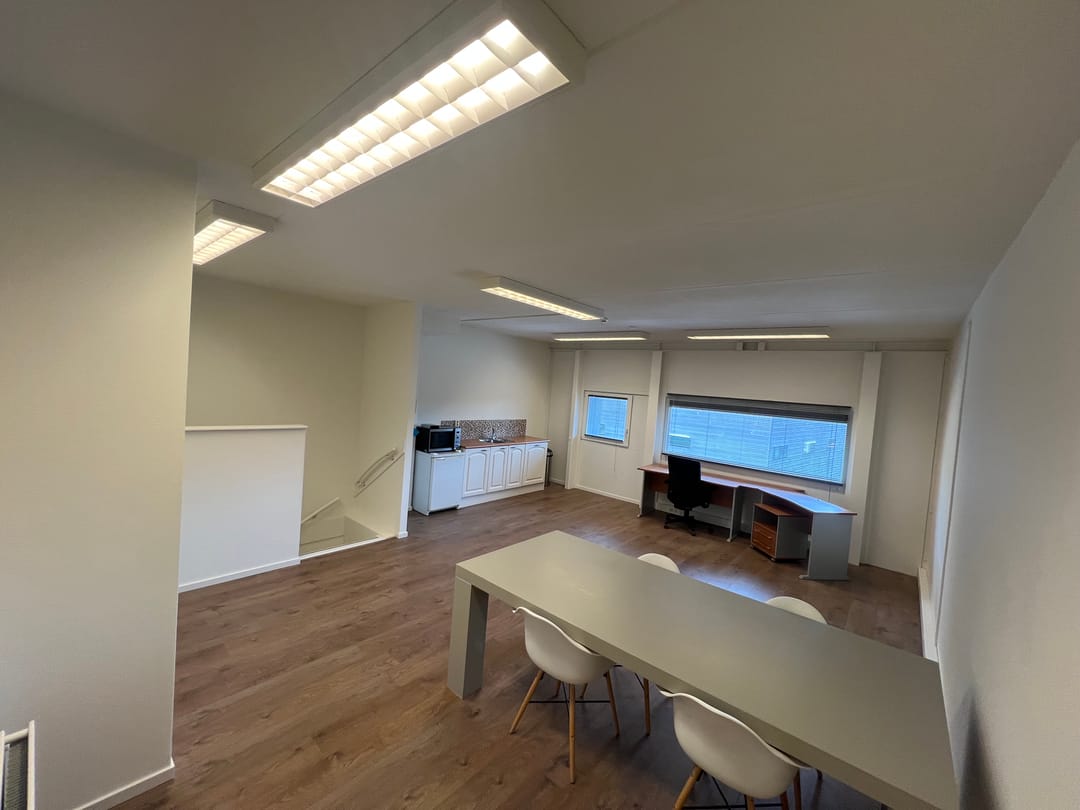 • Verdieping (ca. 43 m²): nette kantoorruimte met luxe pantry, vaste kasten en veel daglicht. Vrije hoogte 2,70m