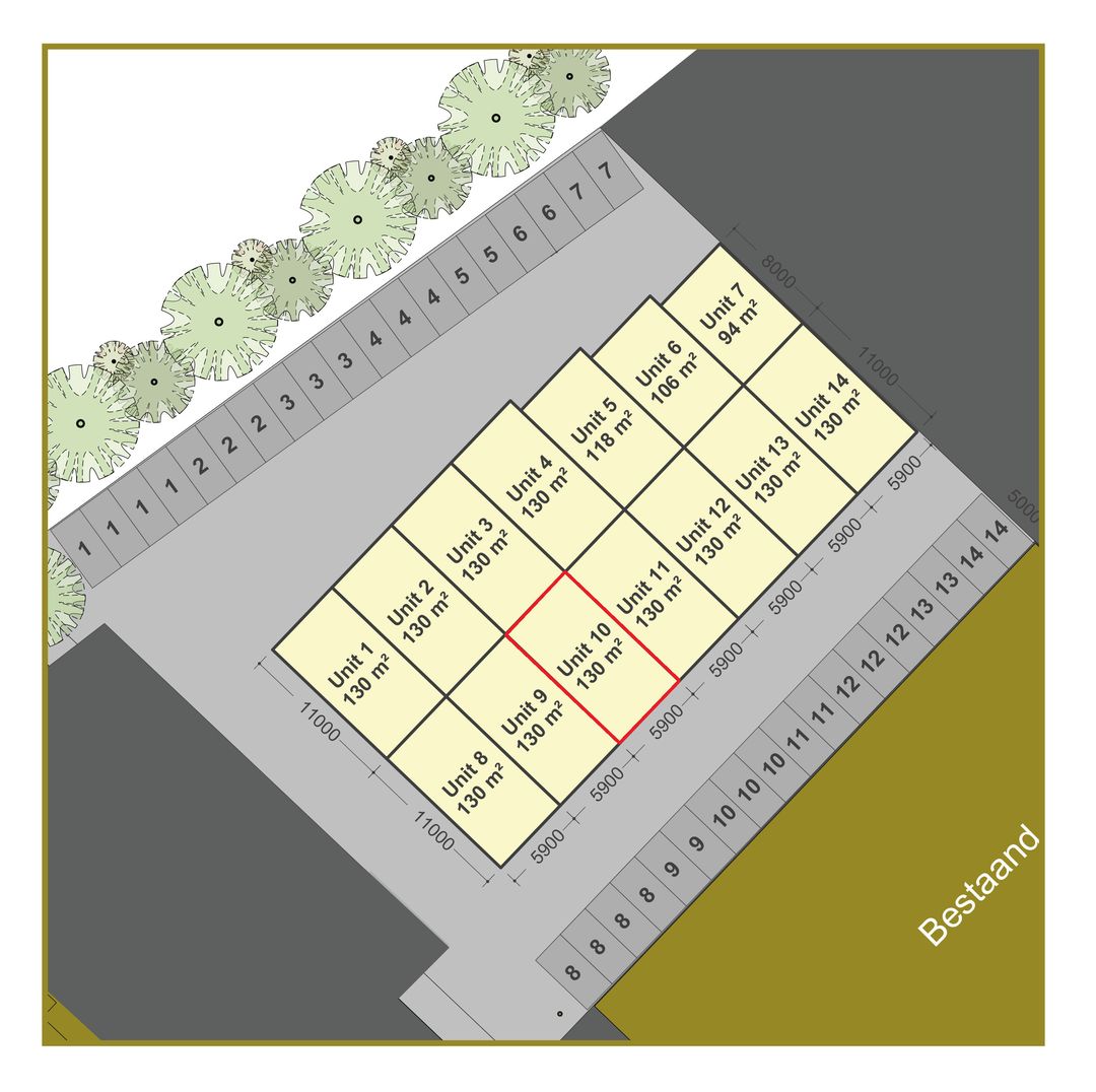 3 parkeerplaatsen beschikbaar, gelegen aan de voorzijde van de bedrijfsunit.