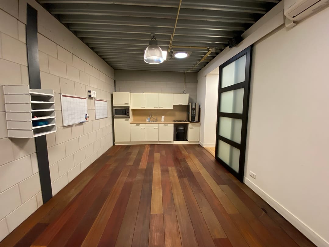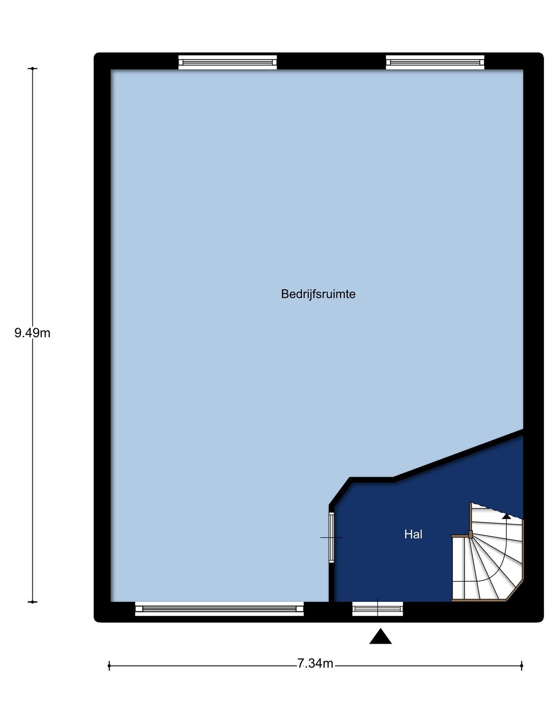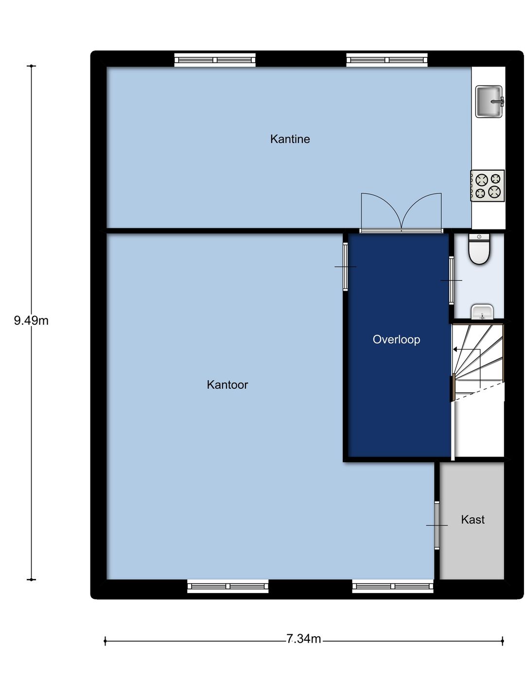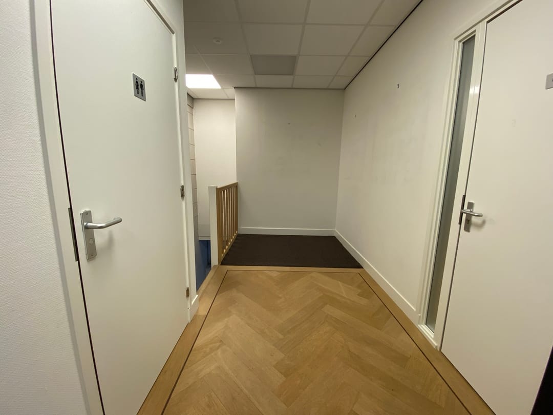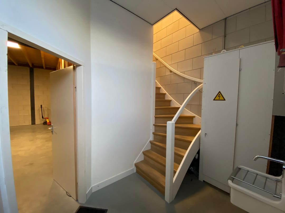 Entree, met trapopgang naar verdieping waar 2 kantoorruimtes, keuken en wc zich bevinden. Op de begane grond bevind zich de bedrijfsruimte.