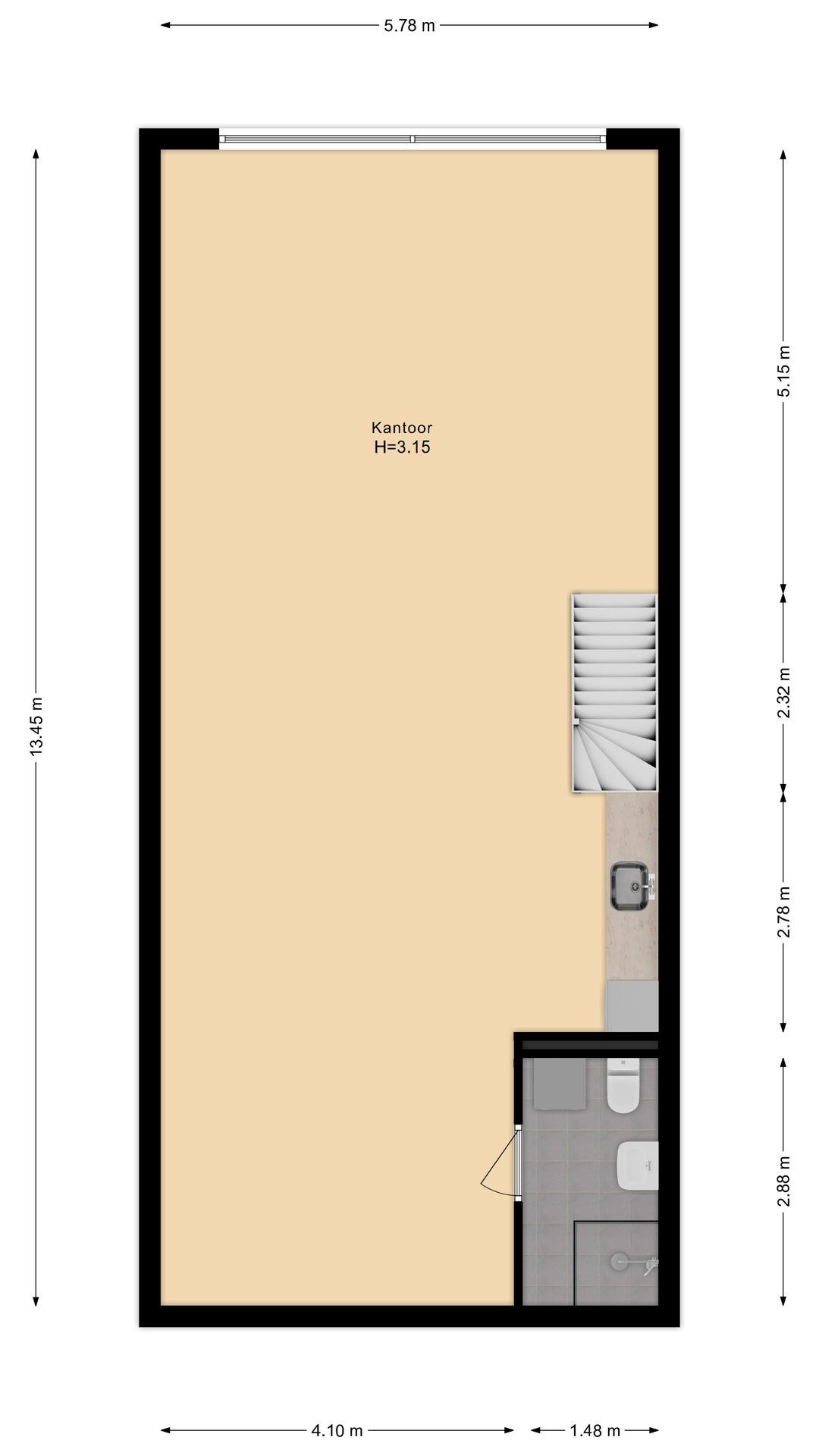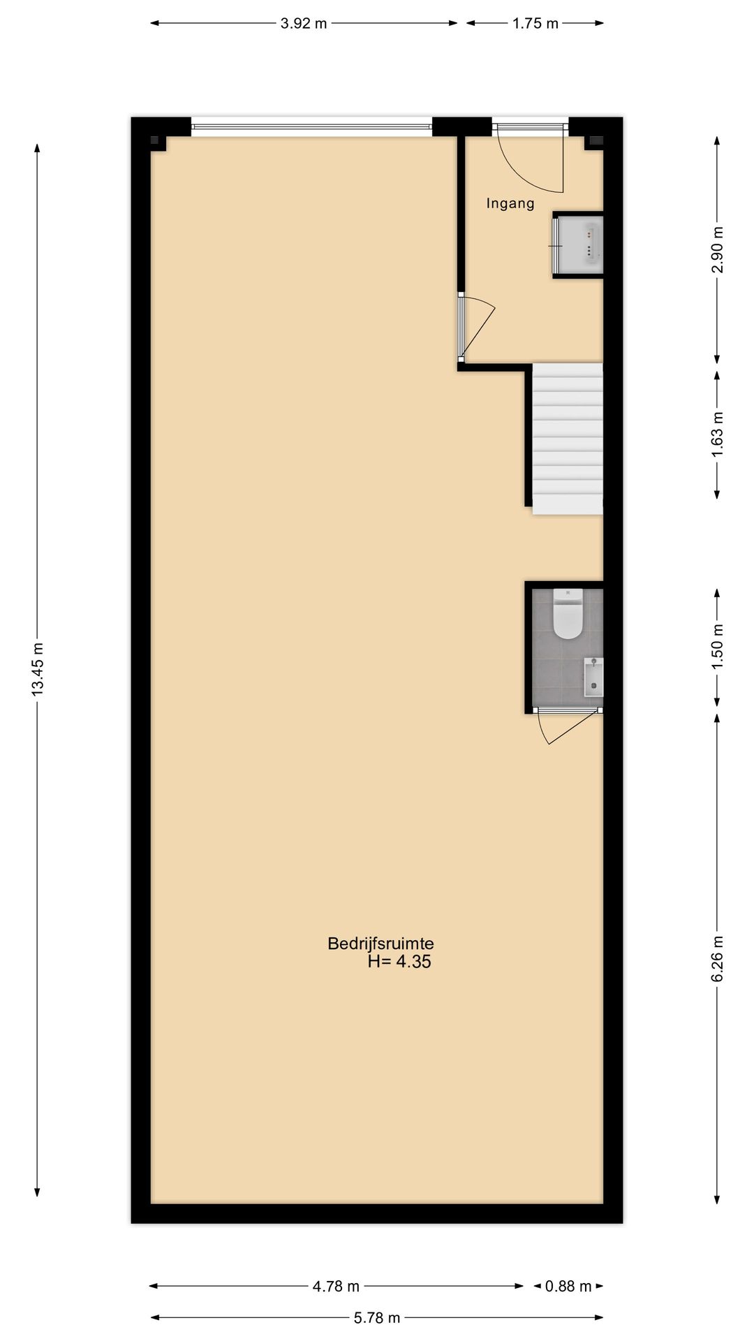 De bedrijfsruimte, met aparte entree, omvat een open bedrijfsruimte van circa 78 m² netto vloeroppervlak. Er is tevens een 2e toiletruimte aanwezig.