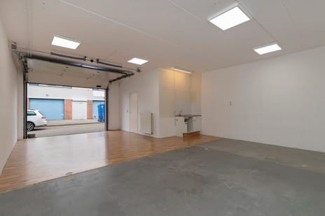 Spacious entrance, business space with 1 overhead door, toilet and sink.