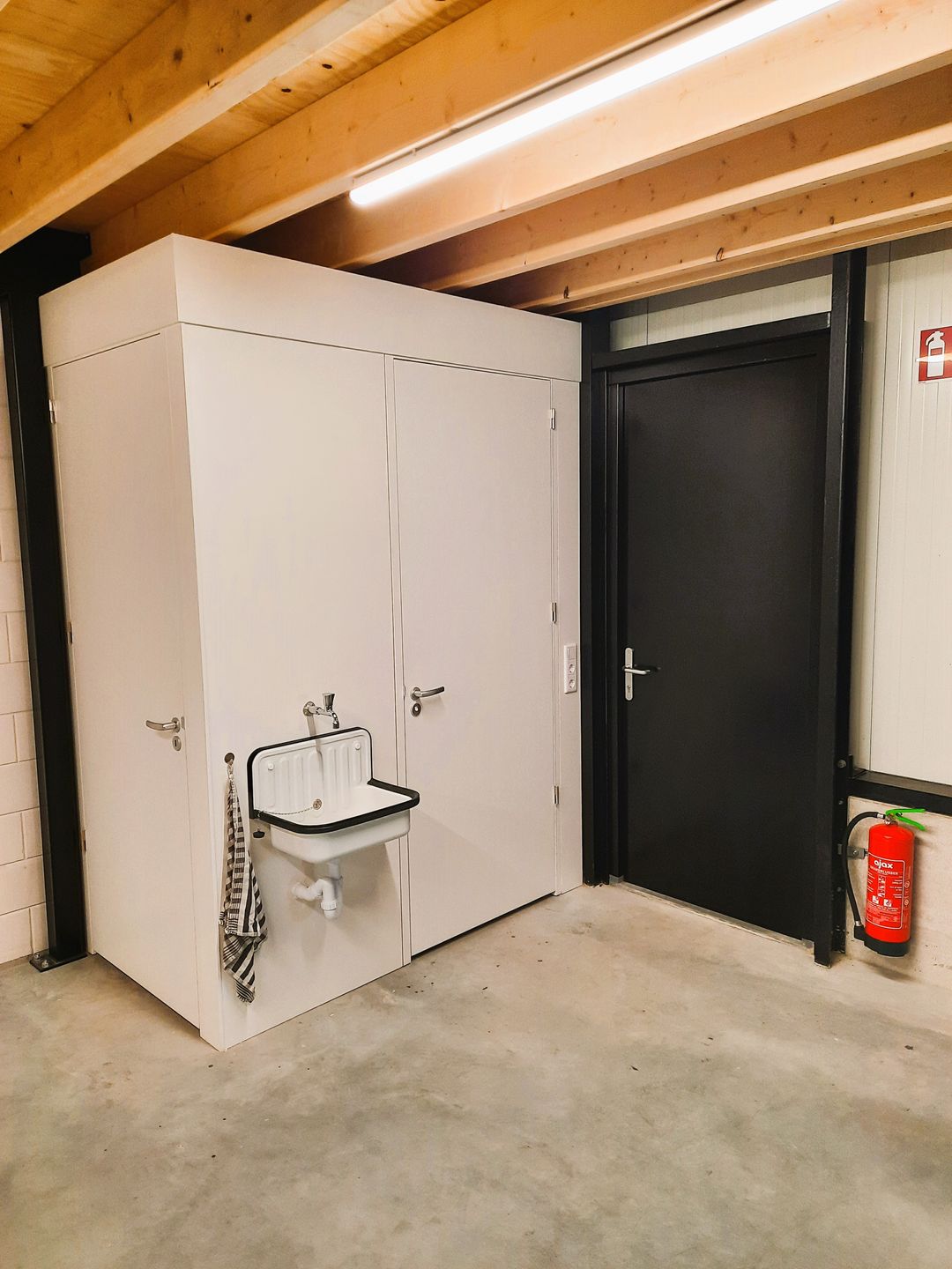 De ruimte is toegankelijk via de elektrische overheaddeur en loopdeur. De ruimte is voorzien van toilet, wastafel, krachtstroom, vaste trap naar de verdieping welke een afneembare balustrade heeft en extra verlichting onder de verdiepingsvloer.
