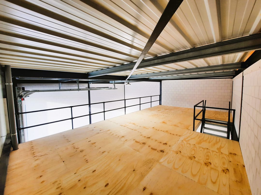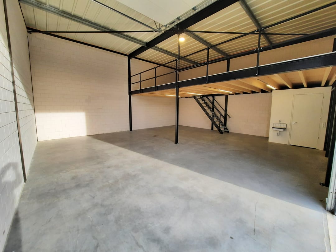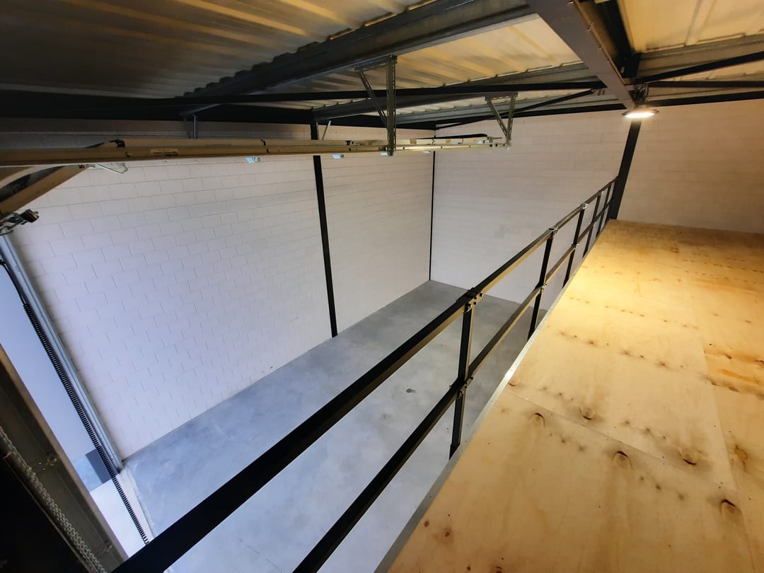 De ruimte is toegankelijk via de elektrische overheaddeur en loopdeur. De ruimte is voorzien van toilet, wastafel, krachtstroom, vaste trap naar de verdieping welke een afneembare balustrade heeft en extra verlichting onder de verdiepingsvloer.