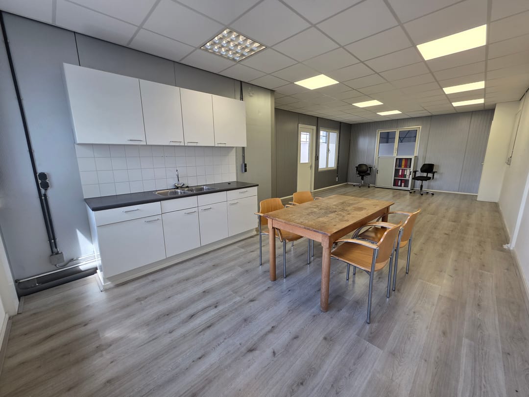 Entree middels loopdeur, naast de grote overheaddeur. Toegang tot de bedrijfshal van 435 m² met een vrije hoogte van 6.30 m¹. Aan de voorzijde van het pand een keurige kantoorruimte met pantry en toiletgroep met een totaal bvo van 45 m².