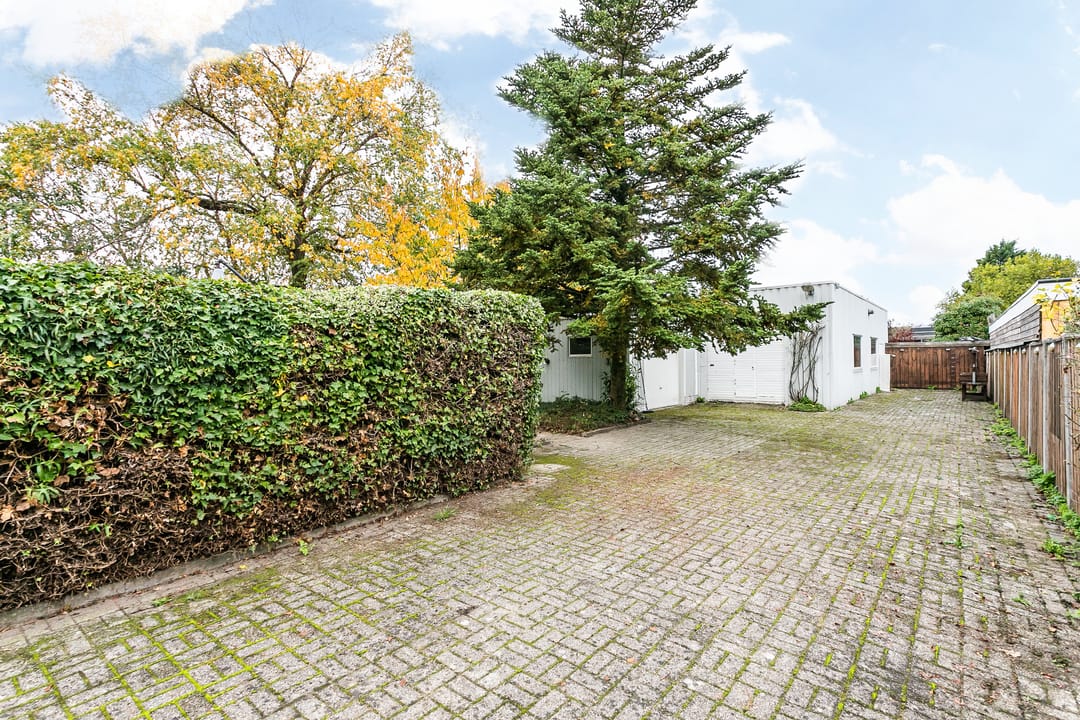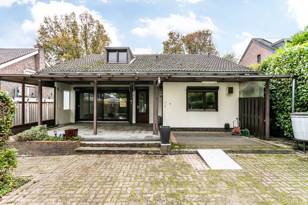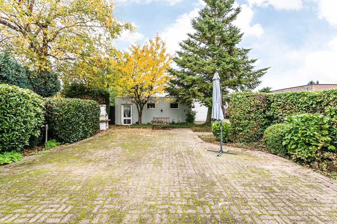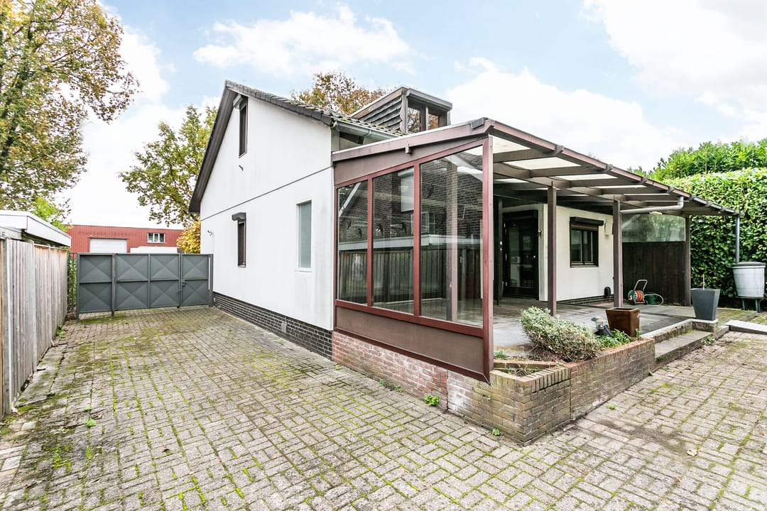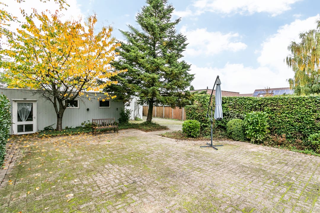Via zowel de keuken als de woonkamer betreedt u het terras met vaste overkapping en de ruime binnenplaats met poort naar de oprit en toegang tot de garage (31m2) met handmatige poort en de royale loods met elektrische sectionaalpoort (104m2), eigen stoppenkast en de loods heeft een hoogte van 3.30m met toegang tot de kelder middels een stenen trap. De achtertuin is voorzien van borders en is geheel omsloten waardoor deze veel privacy biedt.