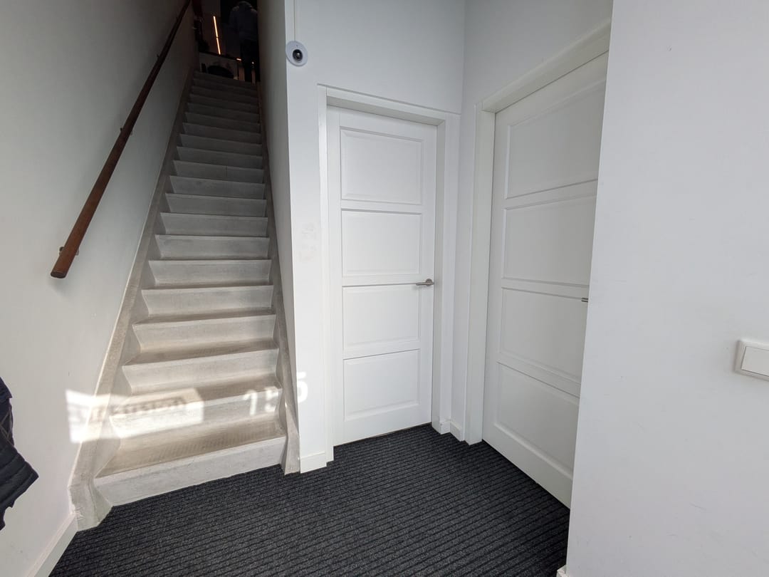 - Laminaatvloer en inpandig houten kozijn voorzien van glas t.p.v. de verdieping;