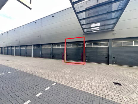 Deze Uniekbox op de hoek van gebouw 3 is uitgevoerd met een glazen pui aan de zijkant met een loopdeur en een roldeur aan de voorzijde. In deze unit met een hoogte van ca. 5.05 m is er ook een verdiepingsvloer gemonteerd waardoor er nog meer ruimte ontstaat voor o.a. een magazijn of kantoor. Hierdoor ontstaan twee verdiepingen met beide een goede werkhoogte van respectievelijk 2.56 en 2.25 m.