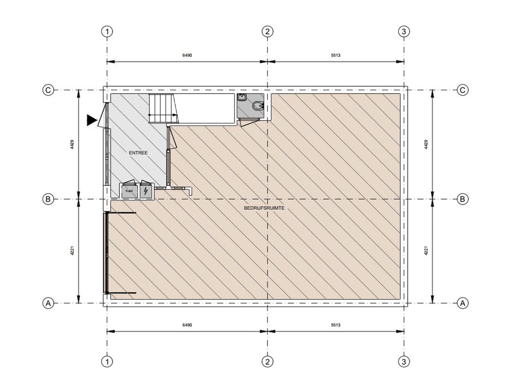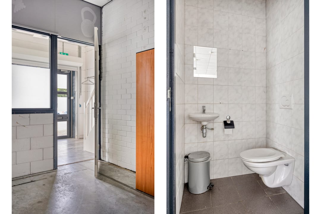 The property comprises a representative entrance hall with meter cupboard, followed by an L-shaped warehouse with toilet facilities, overhead door, and the option to create a loading dock.