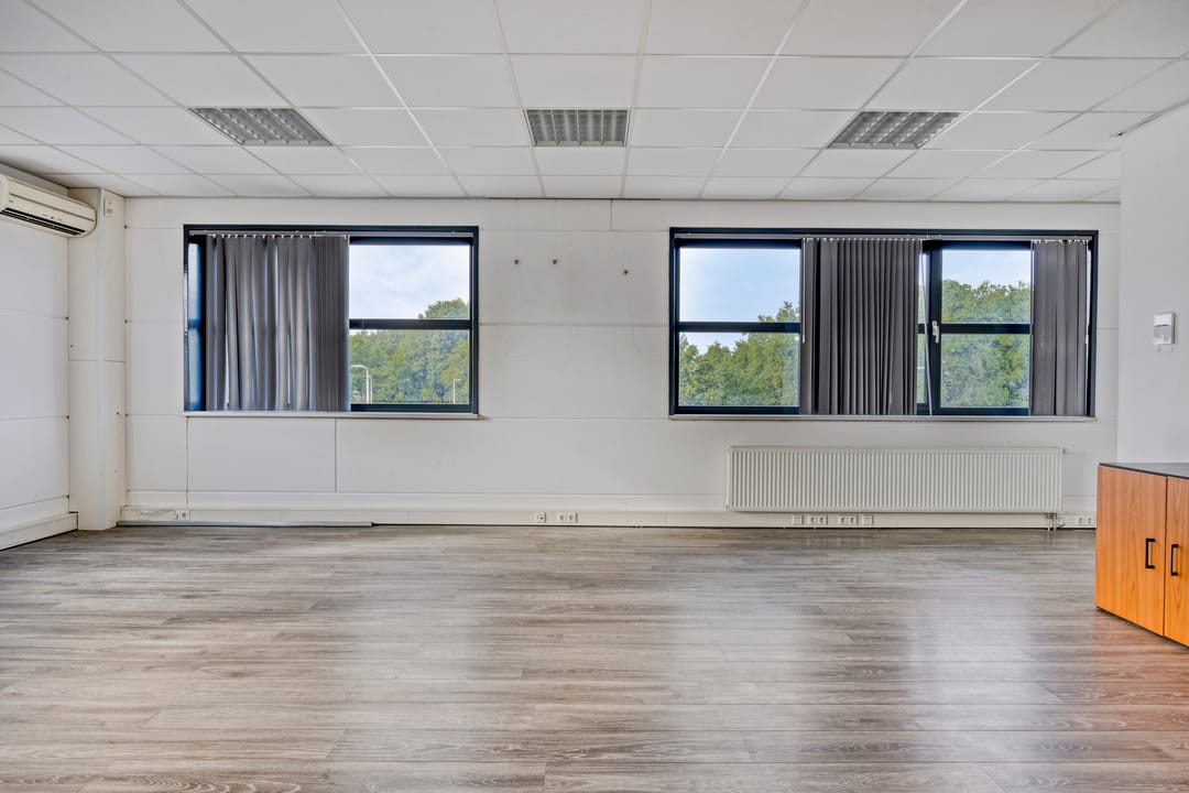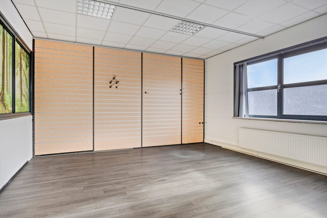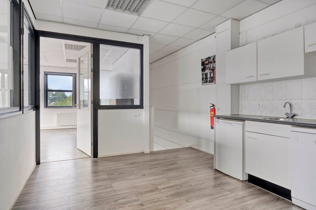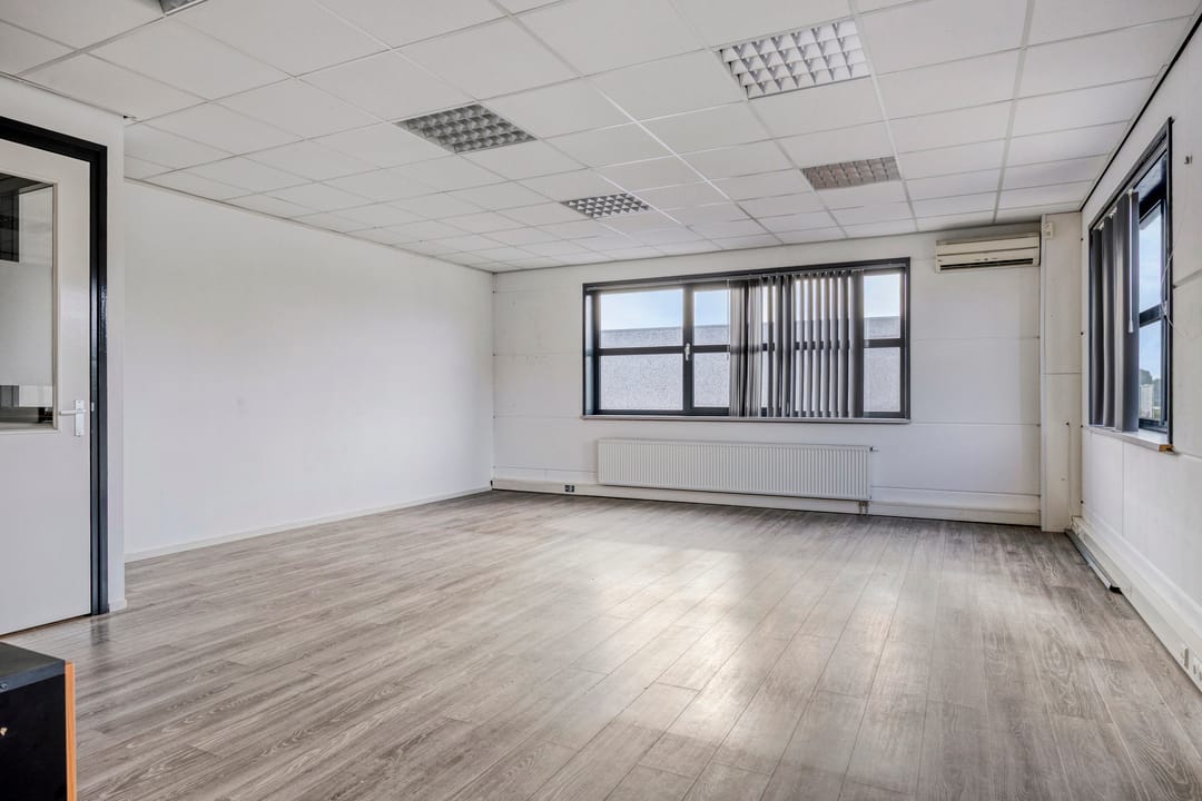 Two office spaces, meeting room, and kitchen (clear height 2.7 m). At the front, an office space of over 40 m² with suspended ceiling, laminate flooring, air conditioning, and unobstructed views of the surroundings.